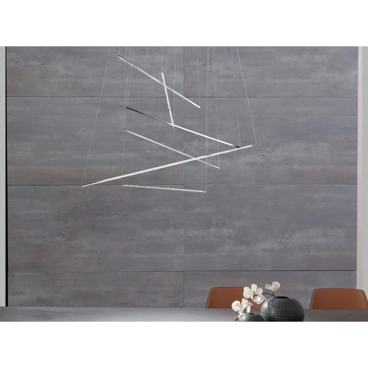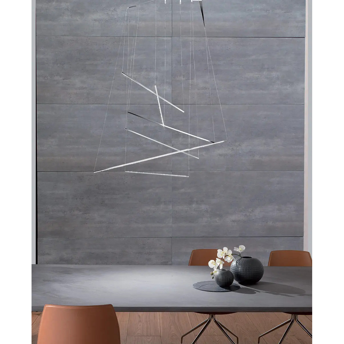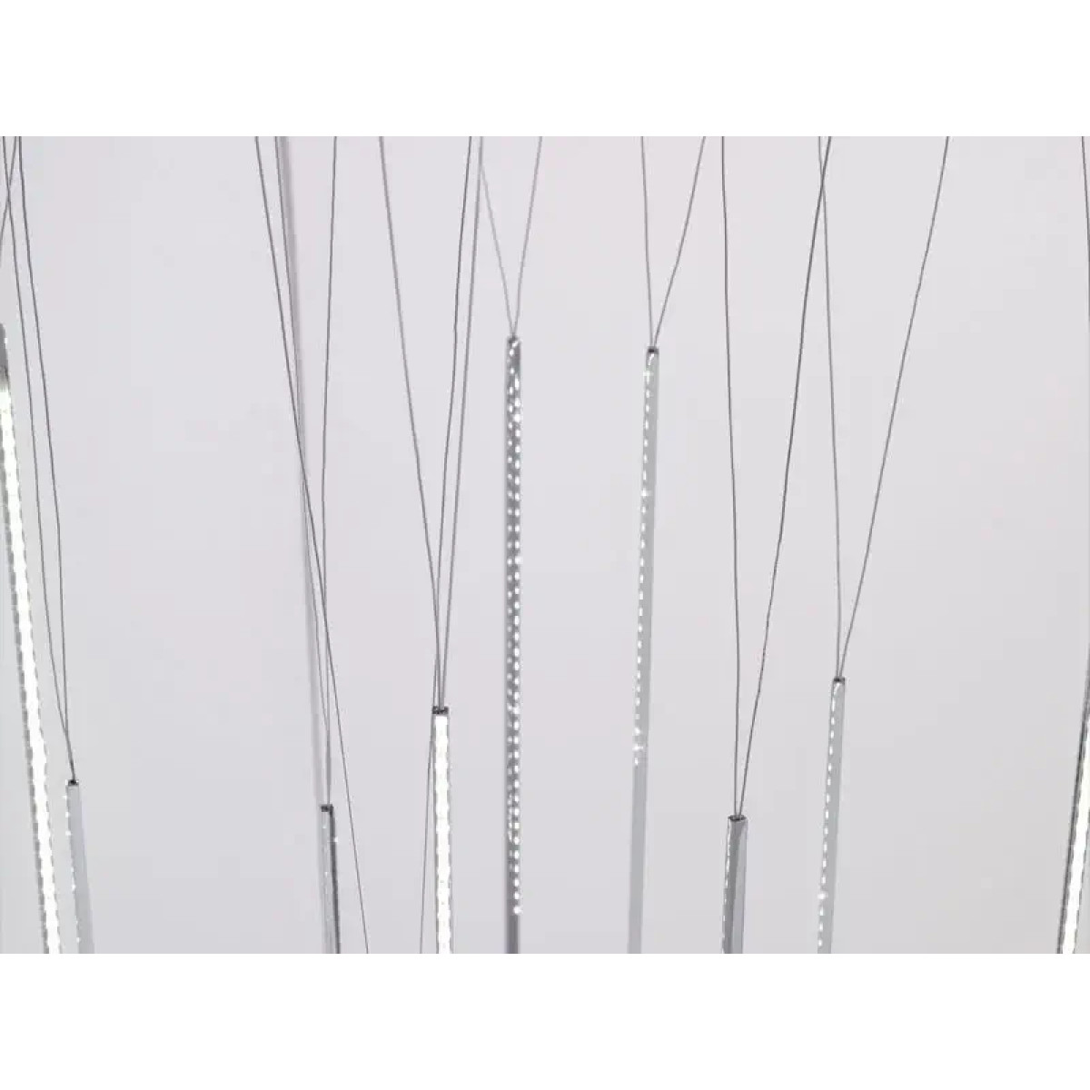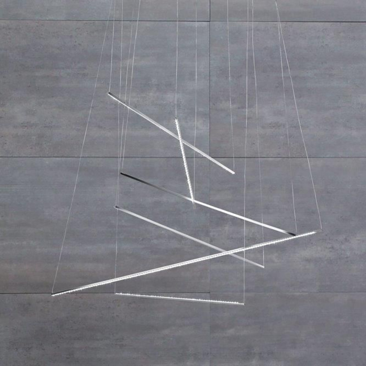 Spillo is a suspension lamp with stem-shaped lights 7x7mm. Different length to intertwine according to the environment. Direct or indirect light on each single light with a simple twisting movement. High efficiency Micro LED strip lighting supplied at 12V. Power supply included. Available in: white liquid enamel (BI), chrome (CR), brushed gold (OR). Driver included.