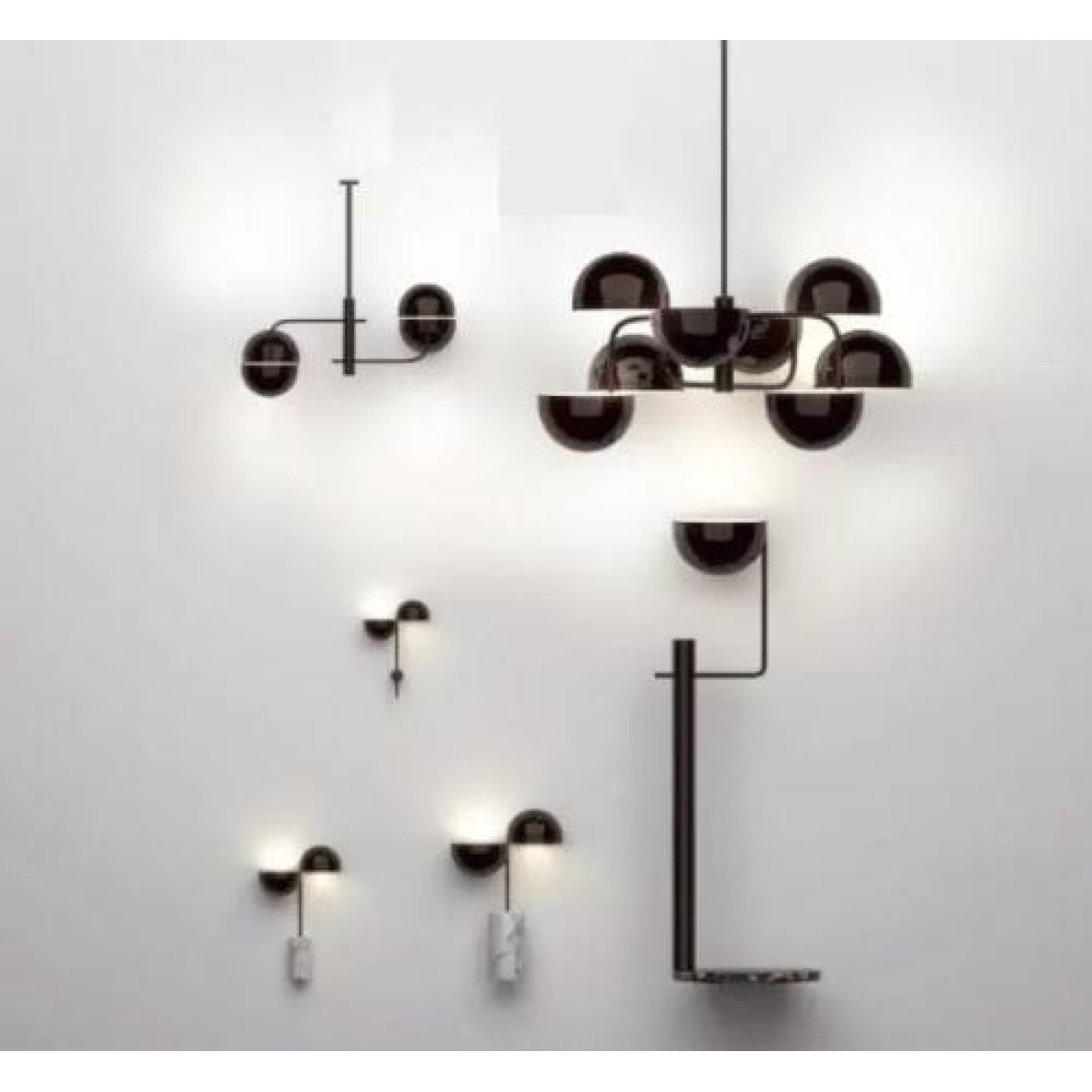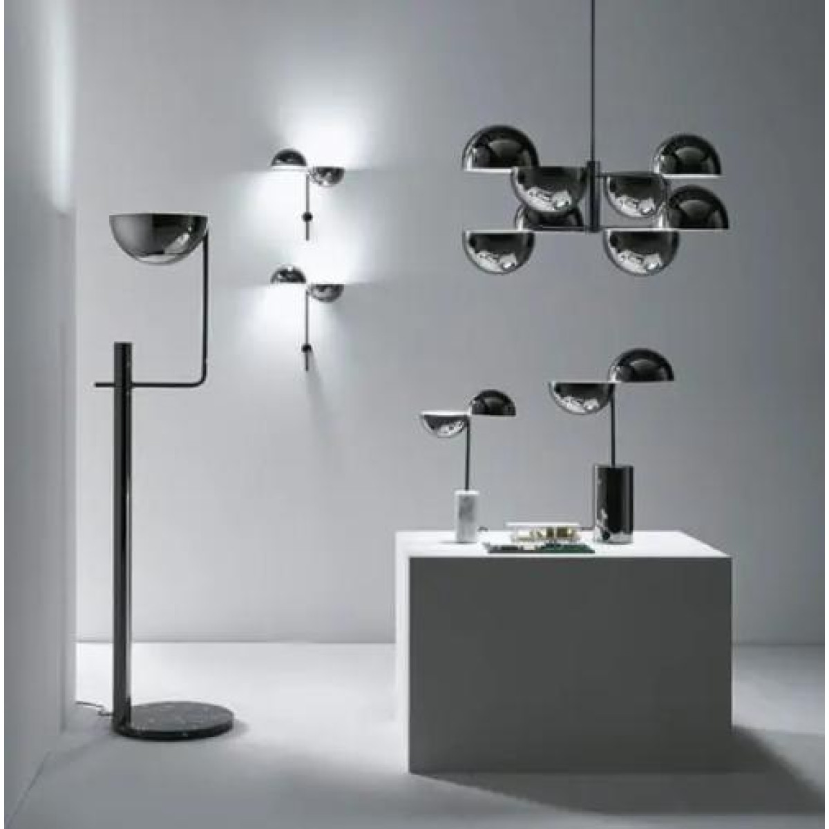 Elisabeth collection is inspired by an astronomical game of hemispheres: from the linear version of the table lamp to the suspension lamp, reminiscent of art deco. The formal cleanliness of the volumes is enriched by glossy metal and Carrara marble.