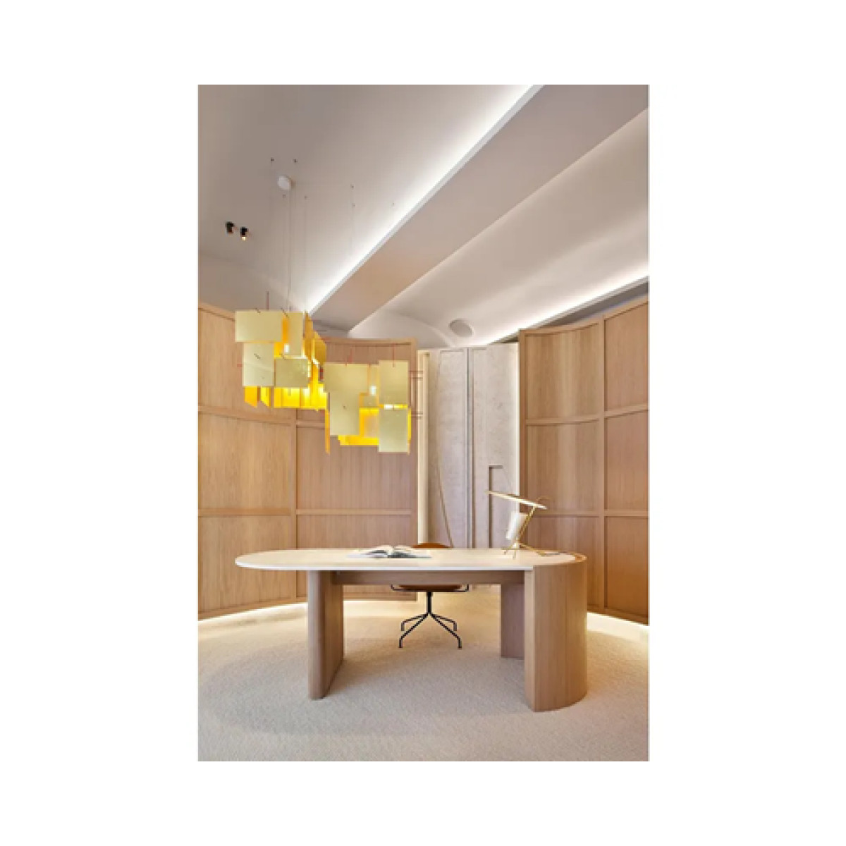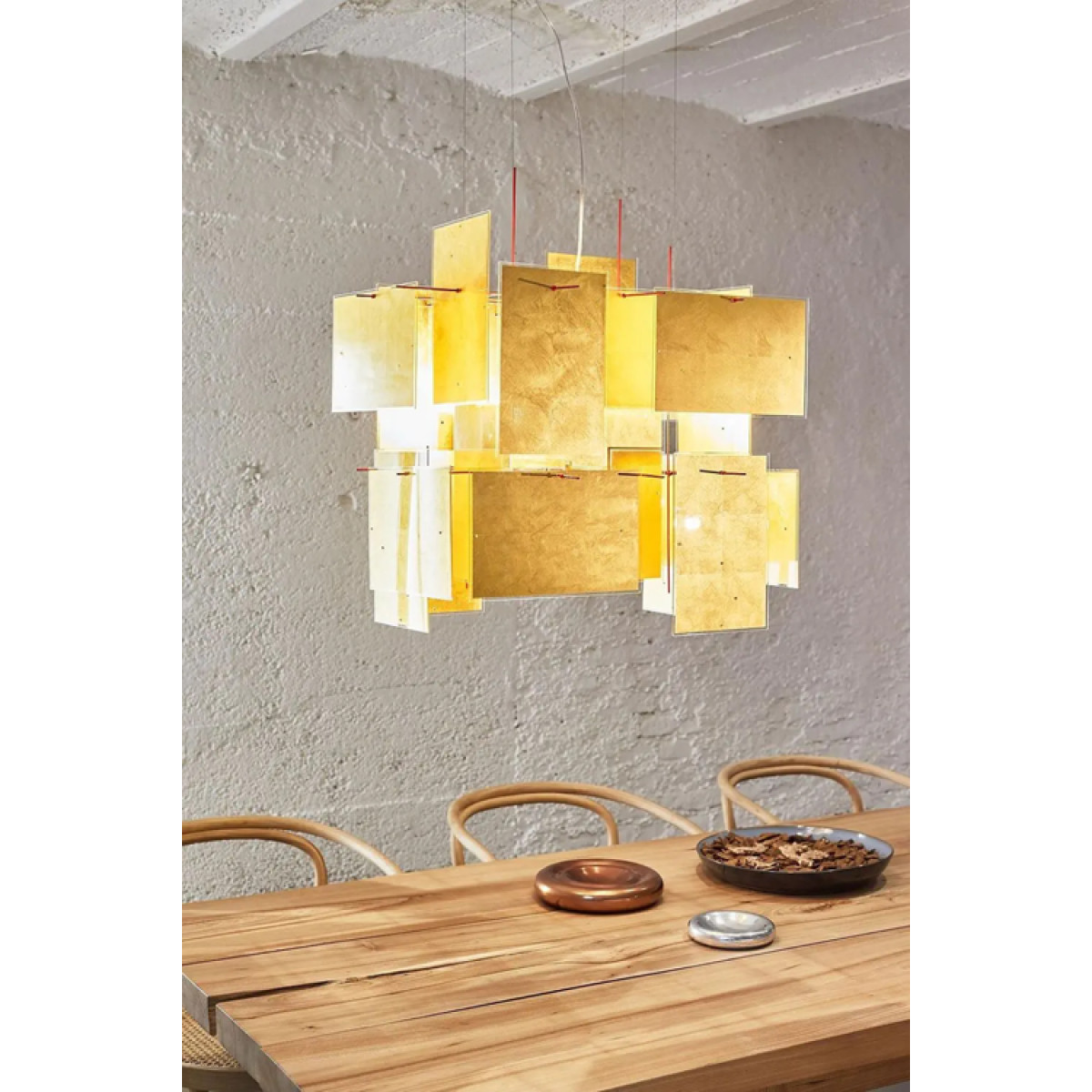 1000 Karat Blau is a large impressive pendant lamp with the appearance of a lighting object. The shades, made of gold leaf and acrylic glass, reflect the light again and again and create an extraordinary warm atmosphere. A stunning piece for homes or other places designed to be welcoming and relaxing. As with the smaller 24 Karat Blau, part of Ingo Maurer’s collection since 2005, short-wave blue light passes through the gold molecules, making the filament appear blue. Combine several 1000 Karat Blau to create unique clusters.