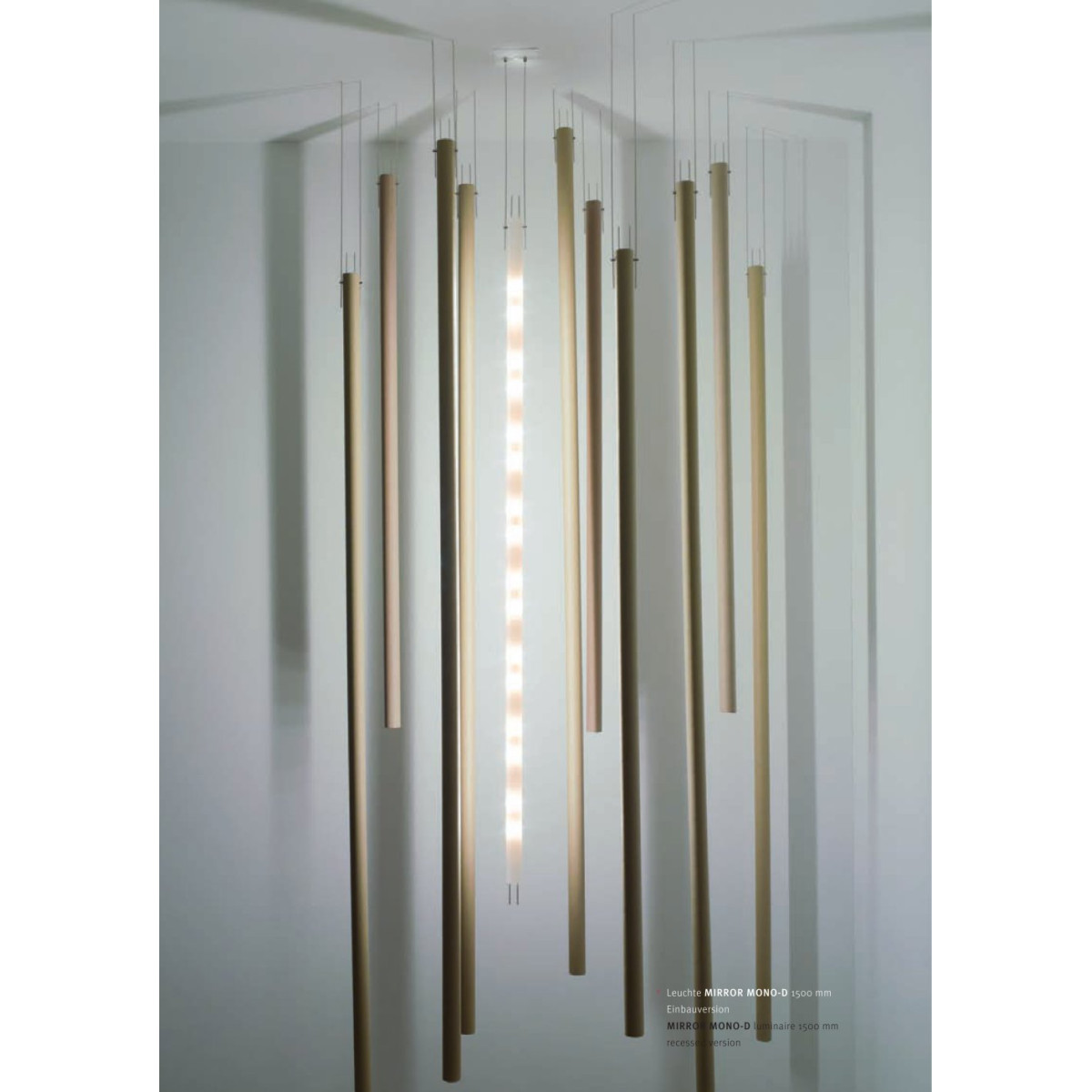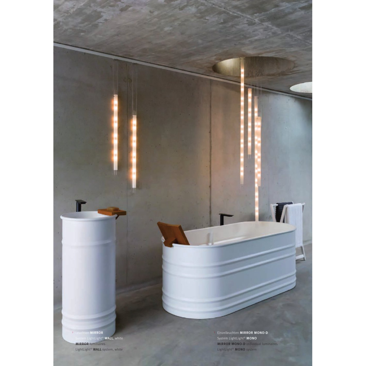MIRROR MONO-D is a surface-mounted luminaire for mirrors, cloakrooms and decorative ambient lighting effects. Like all MIRROR luminaires, MIRROR MONO-D is also available in two lengths: 75 cm (8 lamps) or 150 cm (16 lamps). The frosted glass cylinder can be removed for lamp replacement and cleaning.