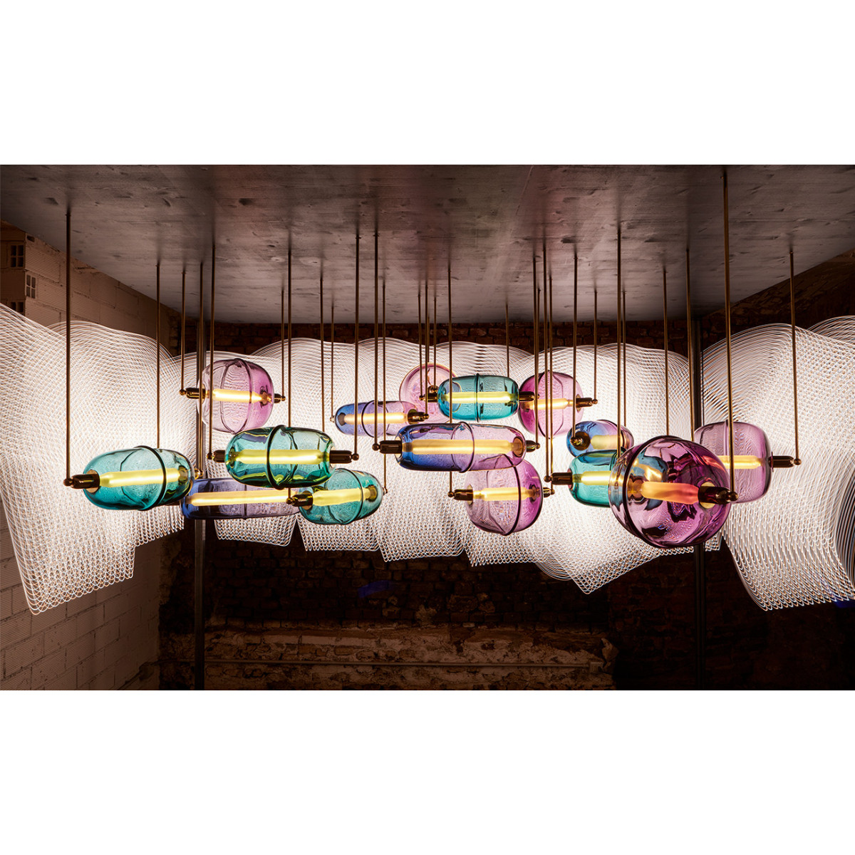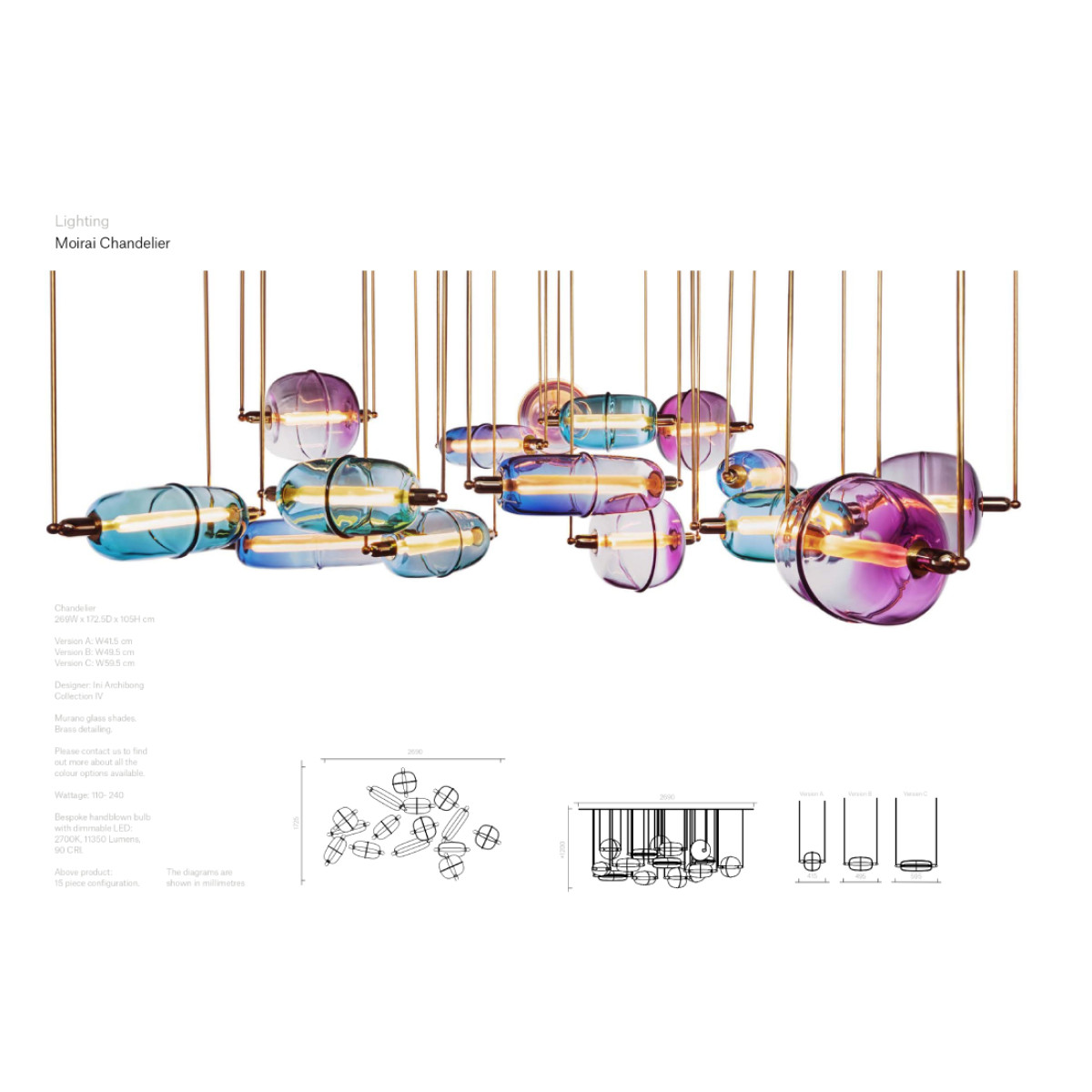 Archibong likens the 12 crystal lamps in the Moirai Chandelier to a “constellation of clouds”. Created by the glass technique of cold-working, it has three main families of shade, which can be combined in different configurations. With brass stem mounts they make for an illuminating conversation.