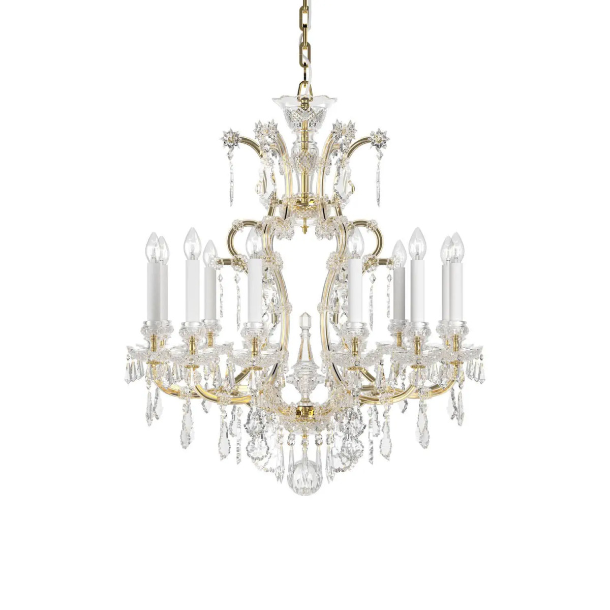 The Maria Theresa is a chandelier of sumptuous curves and shimmering crystal pendalogues. This chandelier illuminated the majestic coronation of Maria Theresa in 1743, who is said to have fallen in love only twice in her life, first with her husband, Francis I, and secondly with this mesmerizing chandelier. Found at Prague Castle and the Schönbrunn Palace, amongst others, this is a truly regal light piece.