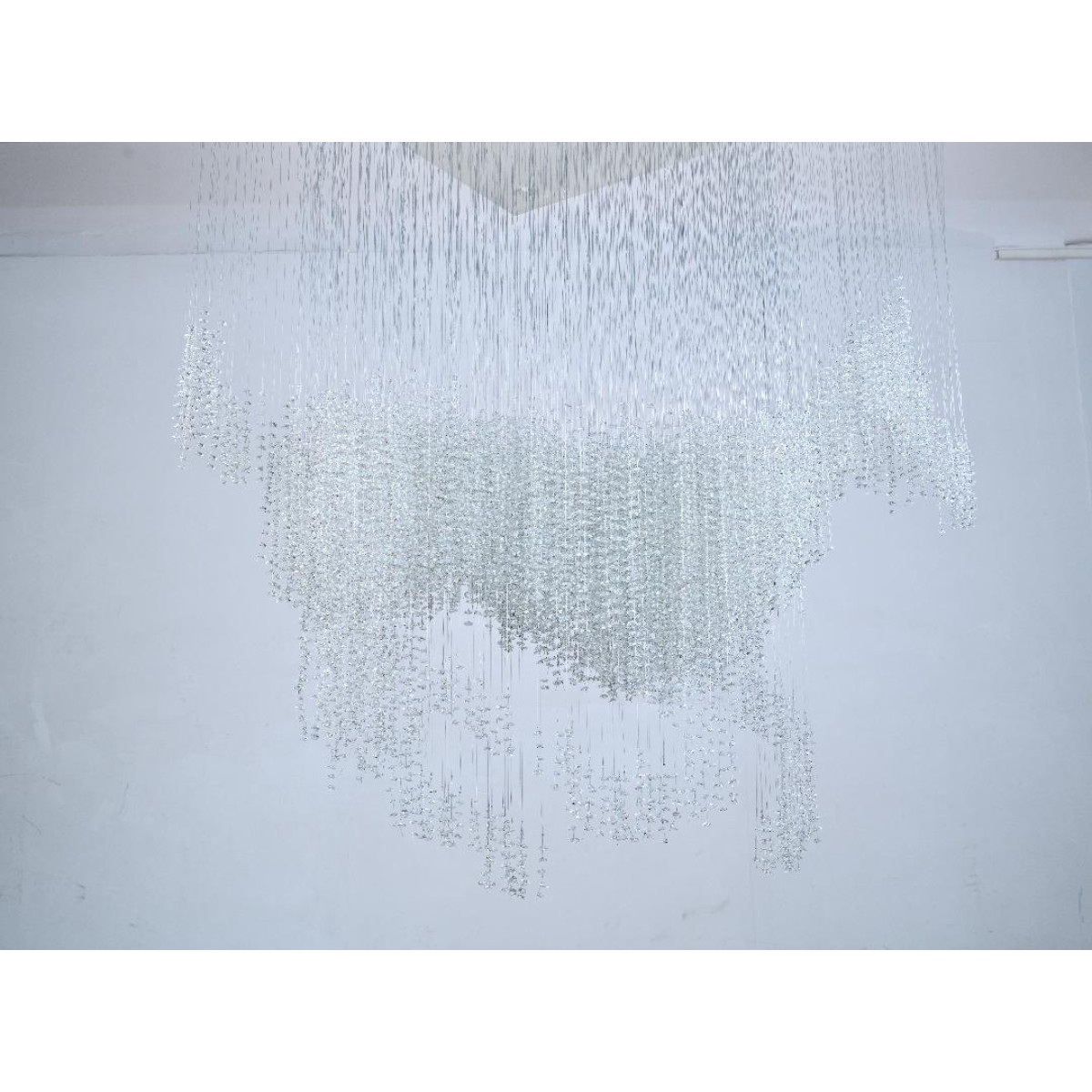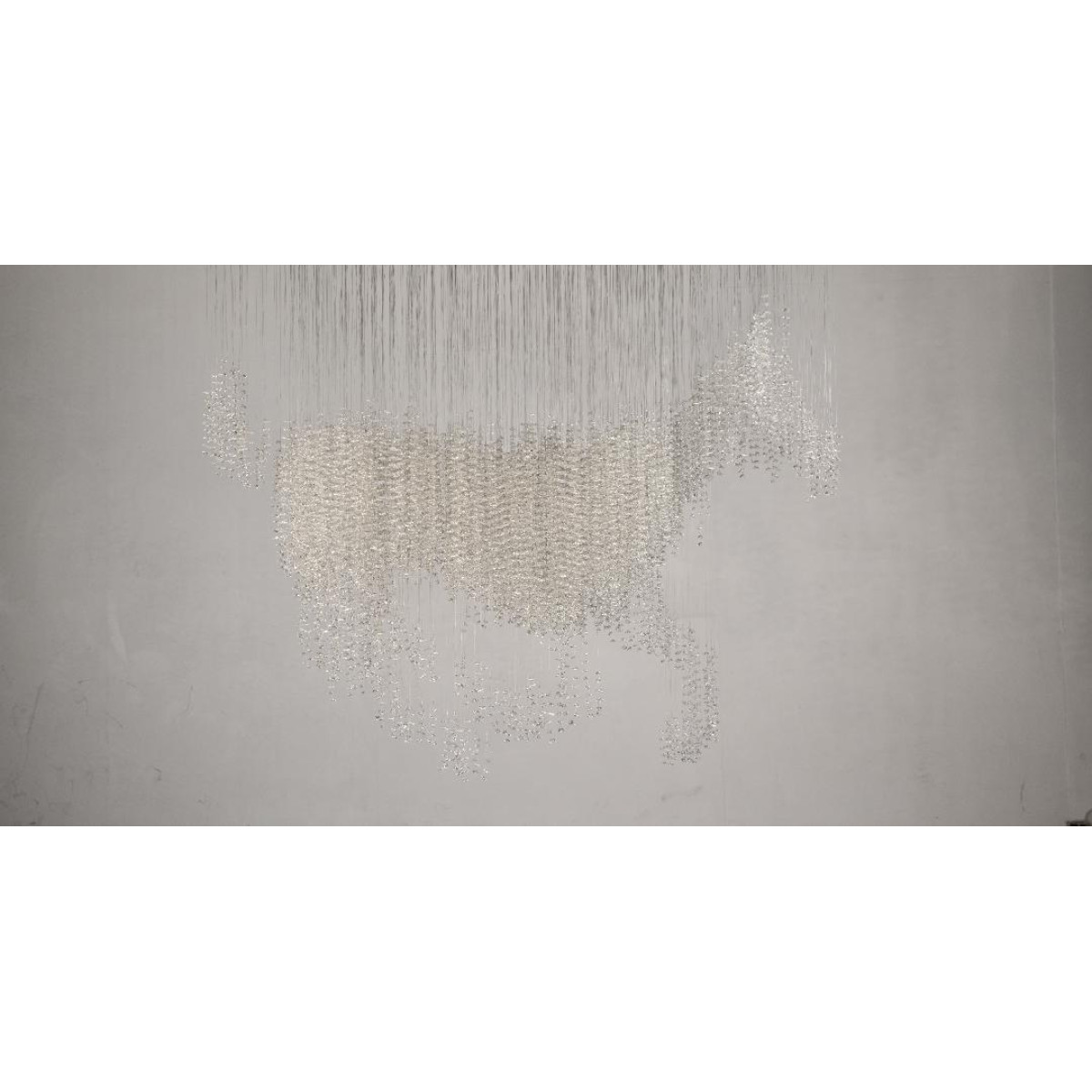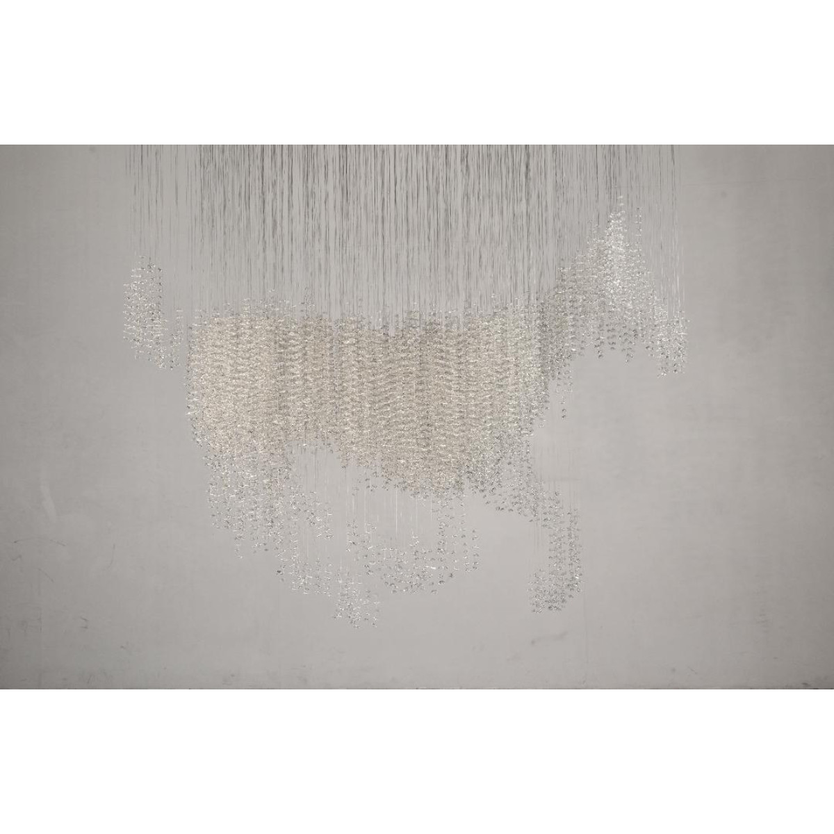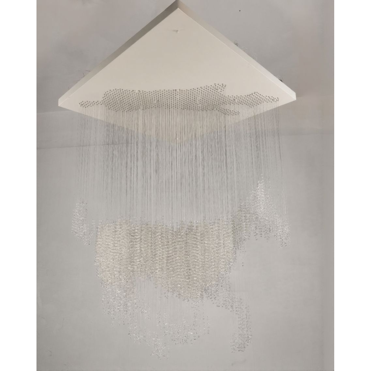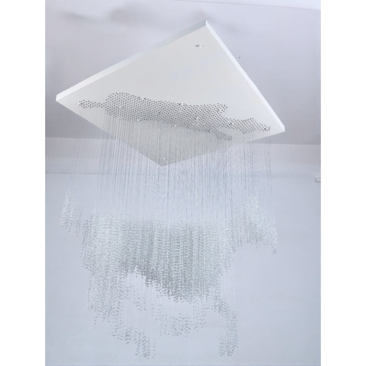 This custom horse crystal sculpture is an elegant ceiling-mounted installation, featuring hundreds of fine crystal strands suspended in precise alignment. The crystals are arranged to form a striking silhouette of a galloping horse, capturing a sense of motion and vitality. The design uses negative space and strategic spacing to give the figure depth and a three-dimensional appearance. A sleek, modern overhead mount supports the delicate strands, making the horse appear to float in midair. The result is a captivating blend of artistry and craftsmanship, perfect as a centerpiece for a luxury interior.