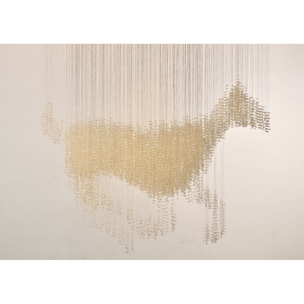This custom horse crystal sculpture is an elegant ceiling-mounted installation, featuring hundreds of fine crystal strands suspended in precise alignment. The crystals are arranged to form a striking silhouette of a galloping horse, capturing a sense of motion and vitality. The design uses negative space and strategic spacing to give the figure depth and a three-dimensional appearance. A sleek, modern overhead mount supports the delicate strands, making the horse appear to float in midair. The result is a captivating blend of artistry and craftsmanship, perfect as a centerpiece for a luxury interior.