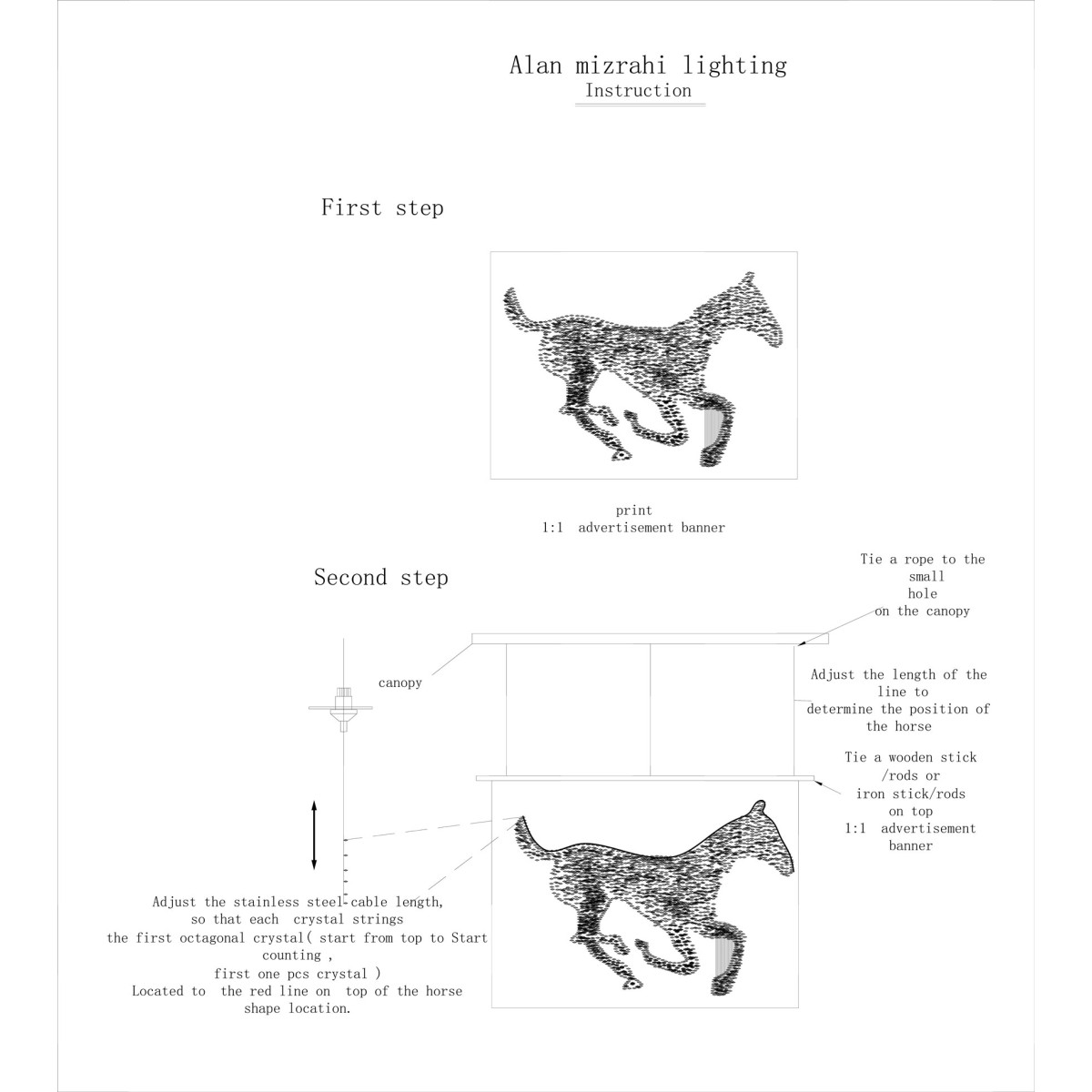 This custom horse crystal sculpture is an elegant ceiling-mounted installation, featuring hundreds of fine crystal strands suspended in precise alignment. The crystals are arranged to form a striking silhouette of a galloping horse, capturing a sense of motion and vitality. The design uses negative space and strategic spacing to give the figure depth and a three-dimensional appearance. A sleek, modern overhead mount supports the delicate strands, making the horse appear to float in midair. The result is a captivating blend of artistry and craftsmanship, perfect as a centerpiece for a luxury interior.