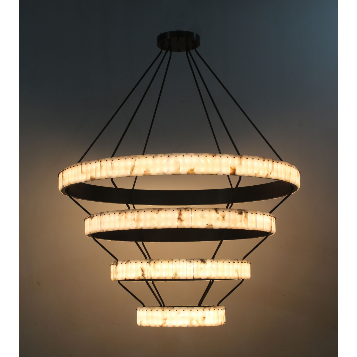Featuring hand-set alabaster tiles arranged in a striking tiered spiral form, this alabaster spiral chandelier was designed in collaboration with Casalola, specifically to enhance grand entryways and maximize vertical sightlines. Its elegant design makes it one of the most desirable ceiling light fixtures for discerning interior designers. The integrated warm LEDs offer a soft, inviting ambiance with both uplight and downlight illumination, ideal for illuminating staircases, galleries, and atrium-scale spaces in residential or hospitality interiors.