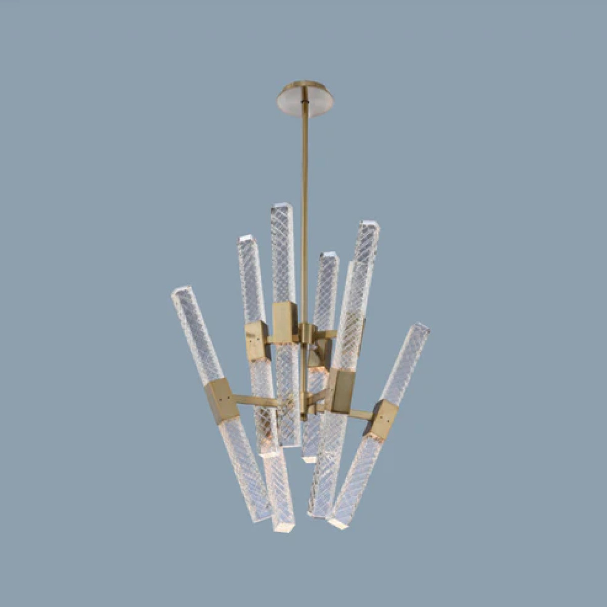 The Apollo Convergent Chandelier by Allegri from the Apollo Collection offers a sleek and contemporary design with driverless LED technology with hand-cut cool clear rectangular crystal rods, warm Brushed Champagne Gold finish.