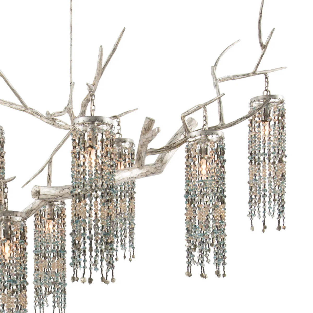 The Coral Sea Chandelier captures the essence of oceanic elegance with its organic branch-like frame finished in a refined Silver Umber Gilt. Eleven cascading pendants adorned with shimmering Blue Lagoon beads create a mesmerizing play of light and texture. Each pendant houses a 25W candelabra light, offering both ambient warmth and luxurious sparkle. Measuring 65" in width, 26" in depth, and 30" in height, this statement piece balances natural inspiration with refined artistry. Perfect for grand dining or living spaces, it brings a serene yet sophisticated coastal charm to any interior.