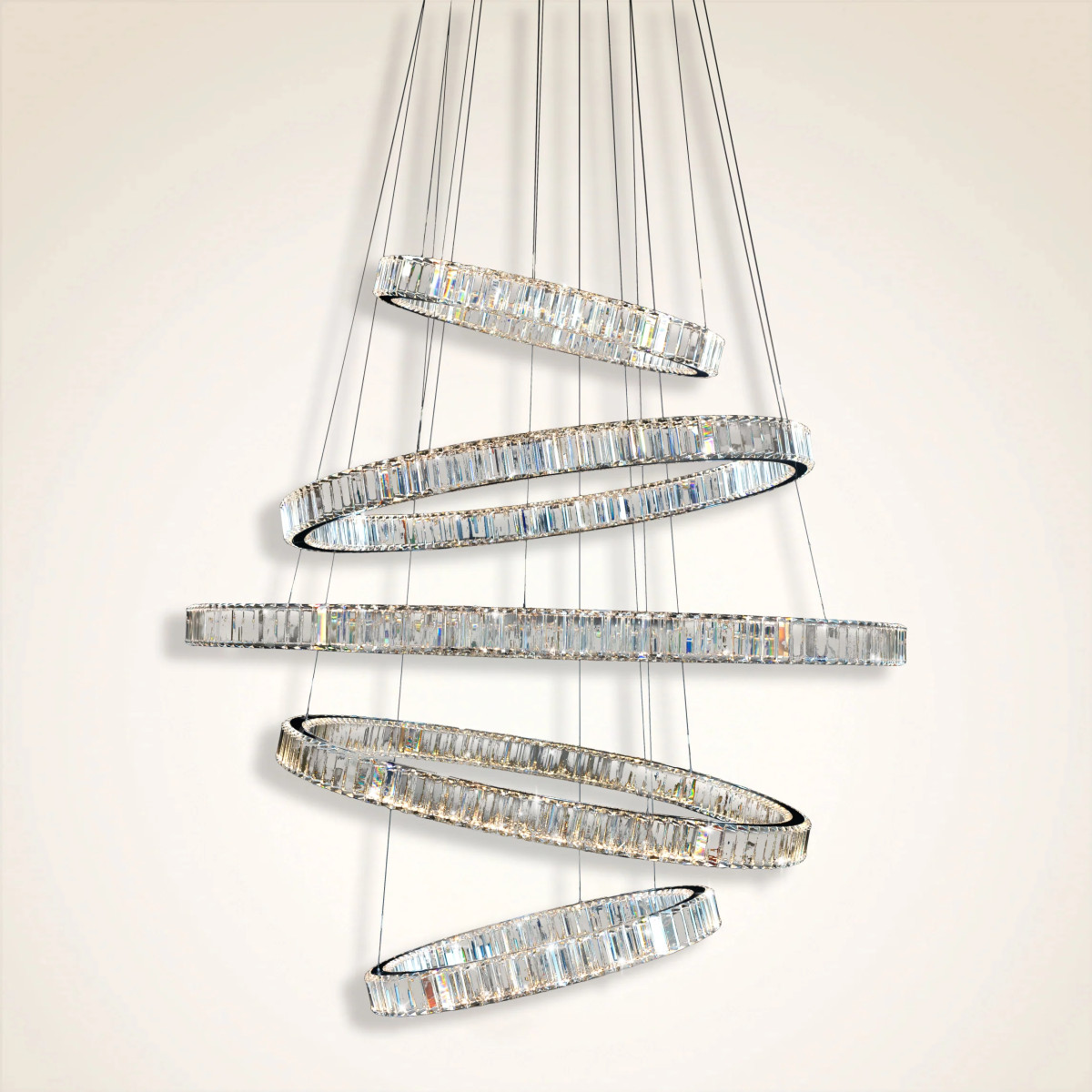 The ANELLO Chandelier is a stunning display of modern elegance, crafted from Polished Stainless Steel and adorned with Clear Cut Crystal Baguettes. Its cascading ring design creates a sense of movement and balance, forming a sculptural centerpiece that captivates from every angle. The precision-cut crystals reflect light brilliantly, filling the space with a soft, prismatic glow. Suspended by sleek cables, the rings can be arranged at varying angles for a dynamic and contemporary effect. Perfect for grand foyers or luxurious dining areas, this chandelier embodies sophistication and architectural artistry.