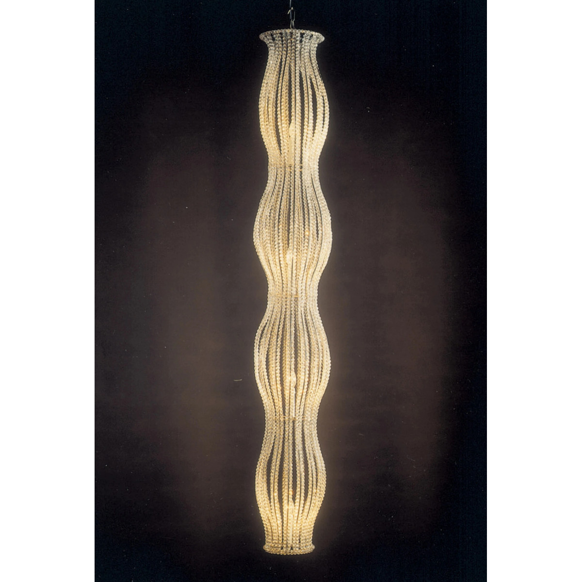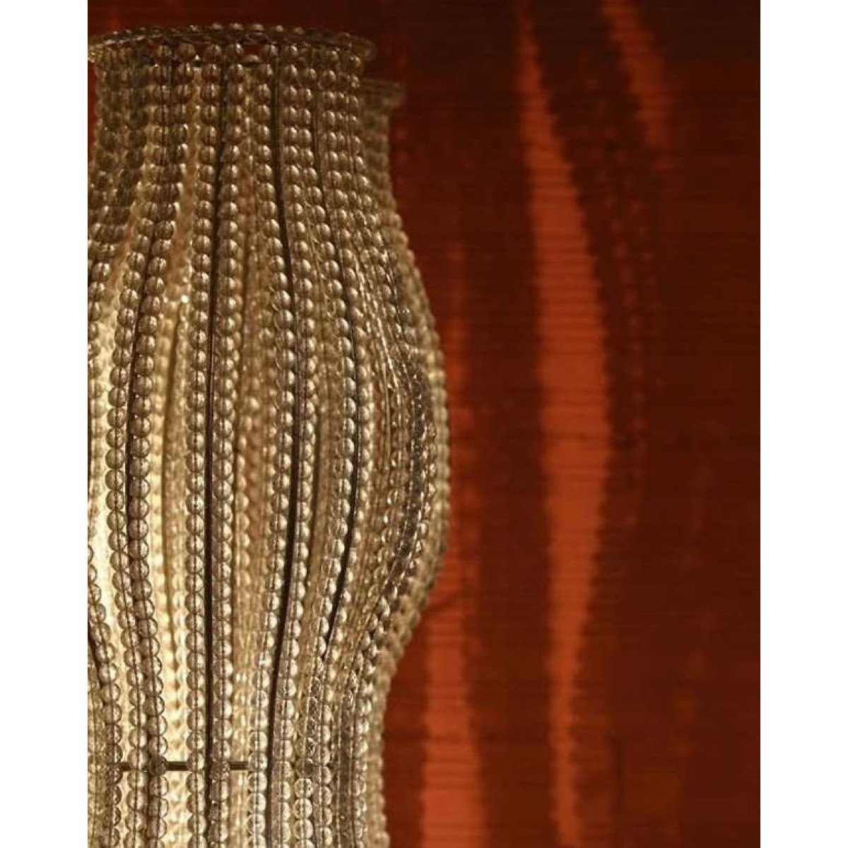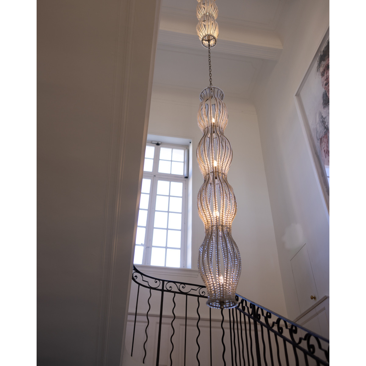The extraordinary Luster Clear Unexpected Visitor unites the highest level of craftsmanship with iconic design. Inspired by sculptural design and French crystal tradition, this light object presents itself as a vertical wave structure made up of countless clear pearl necklaces. The curved silhouette, with its soft waists, creates a unique lighting effect that bathes rooms in warm, flowing reflections – poetic, elegant and absolutely impressive.