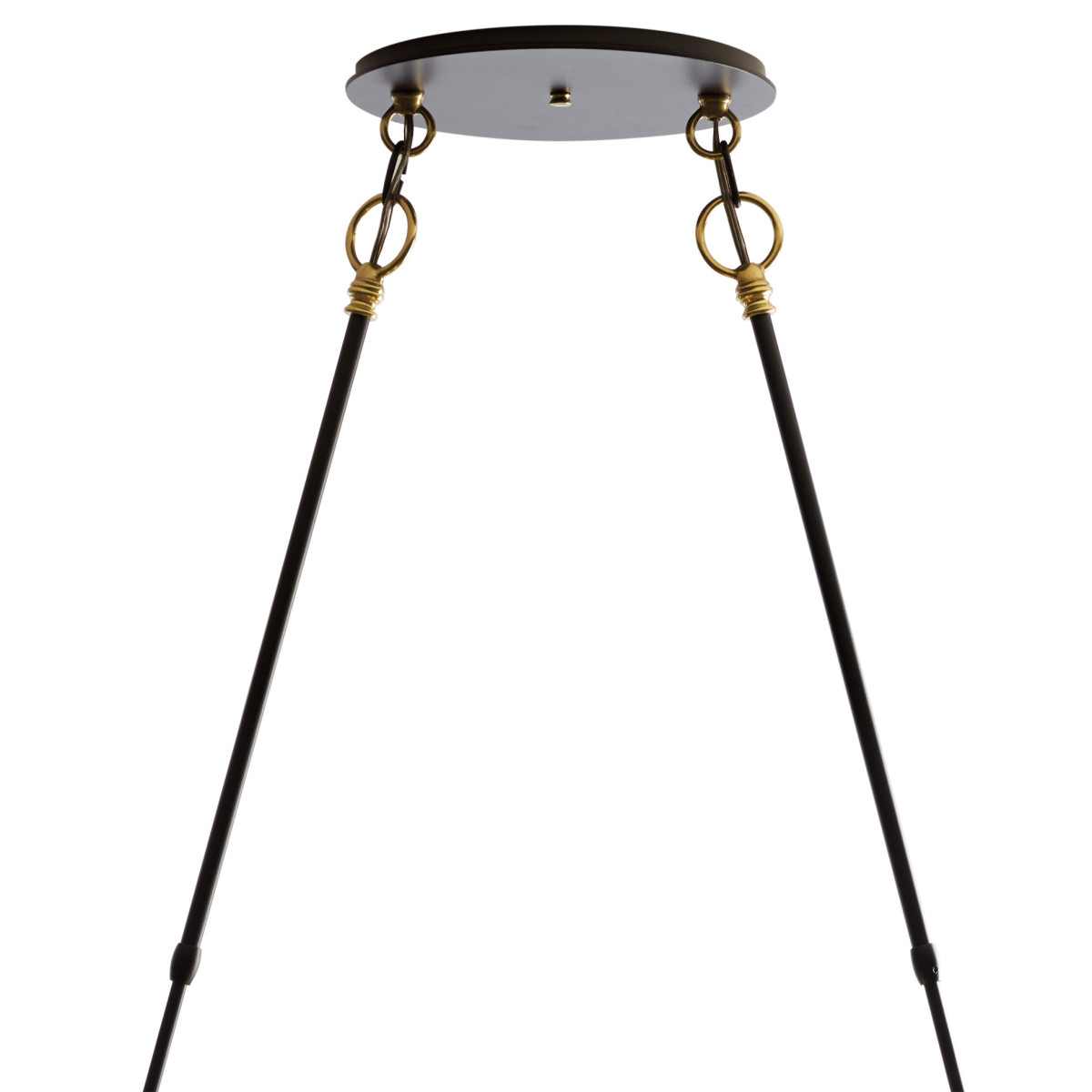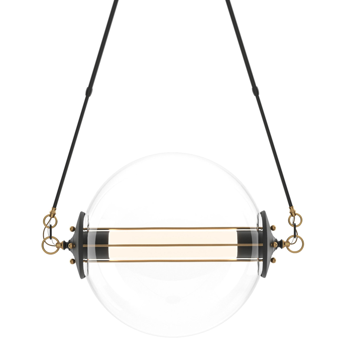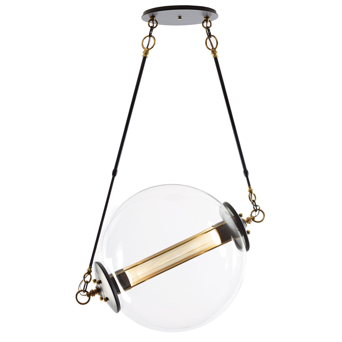 The Otto Sphere Pendant features a large, blown-glass sphere with a Frosted inner tube of light and a Polished Brass and Black finish. Adjust the length of the downrods to position the lighting element as desired.