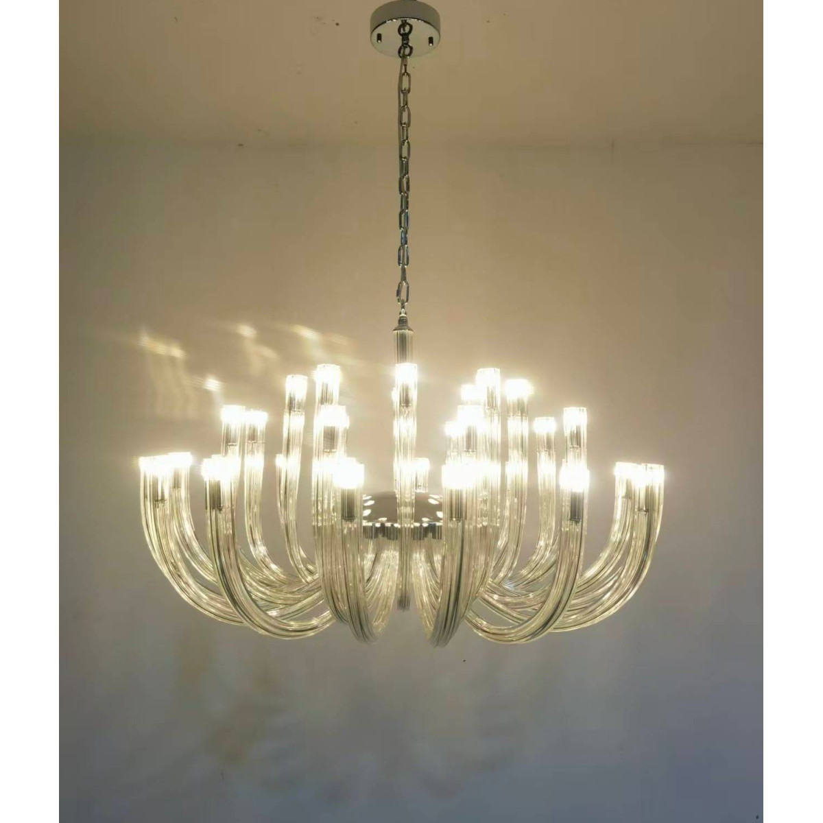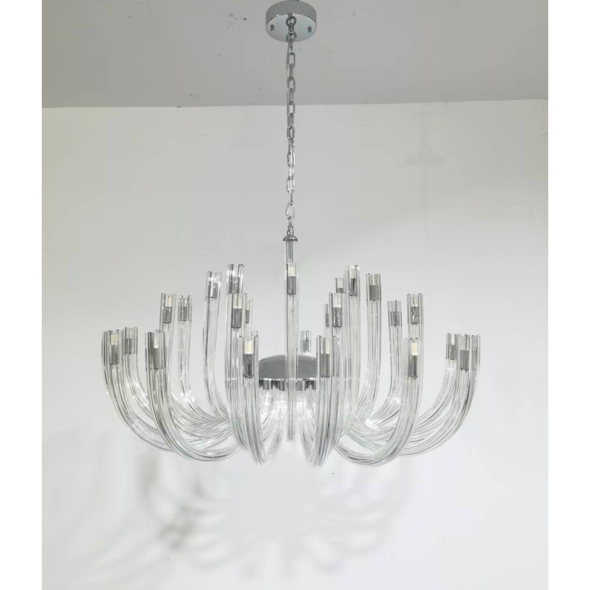 This Metropolitan 32-Light Tier Chandelier is a striking statement piece crafted from polished chrome and clear glass. The design features gracefully curved glass arms that radiate outward in layered symmetry, creating a modern yet elegant visual flow. Each arm holds a sleek cylindrical light, producing a warm and radiant glow that enhances any luxurious space. The chrome accents add a mirror-like finish that complements the crystal-clear glass, amplifying its brilliance. Ideal for grand interiors, this chandelier embodies sophistication and contemporary glamour.