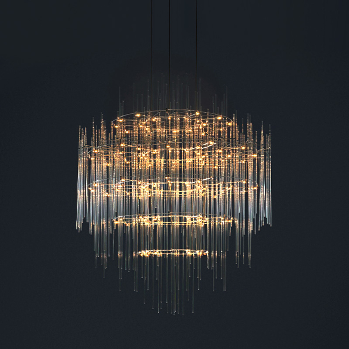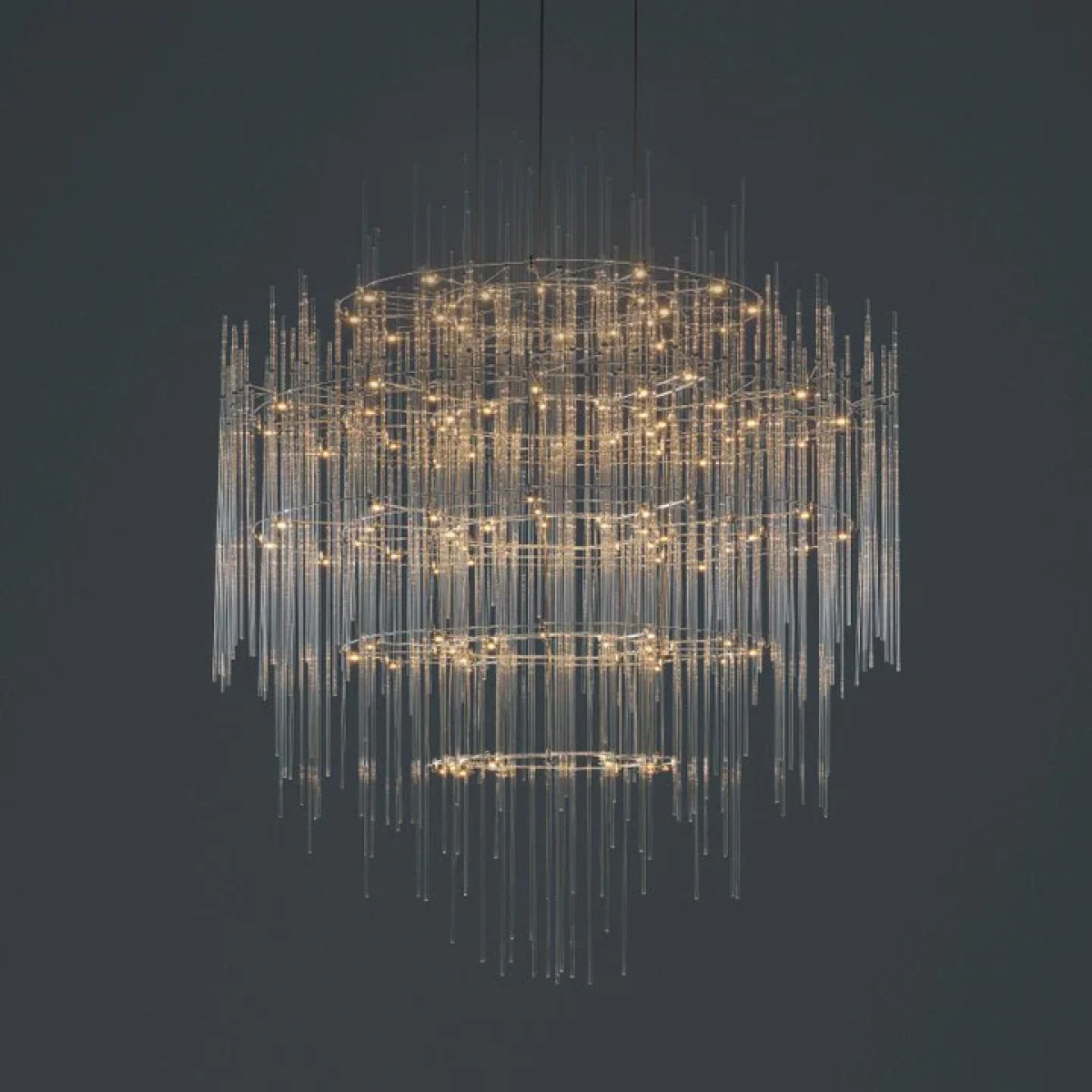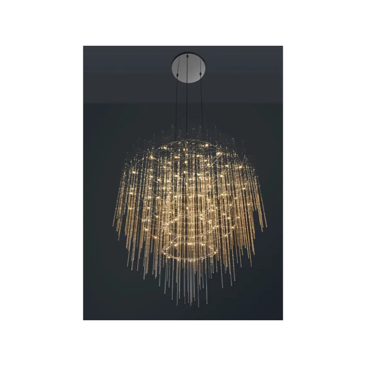 SKYFALL is a glass pendant lamp.‎ The design of SKYFALL stems from the idea of looking up at the stars trough raindrops that are frozen in time.‎ The metal rods and the tiny sparkling glass tubes create this cosmic sculpture.‎