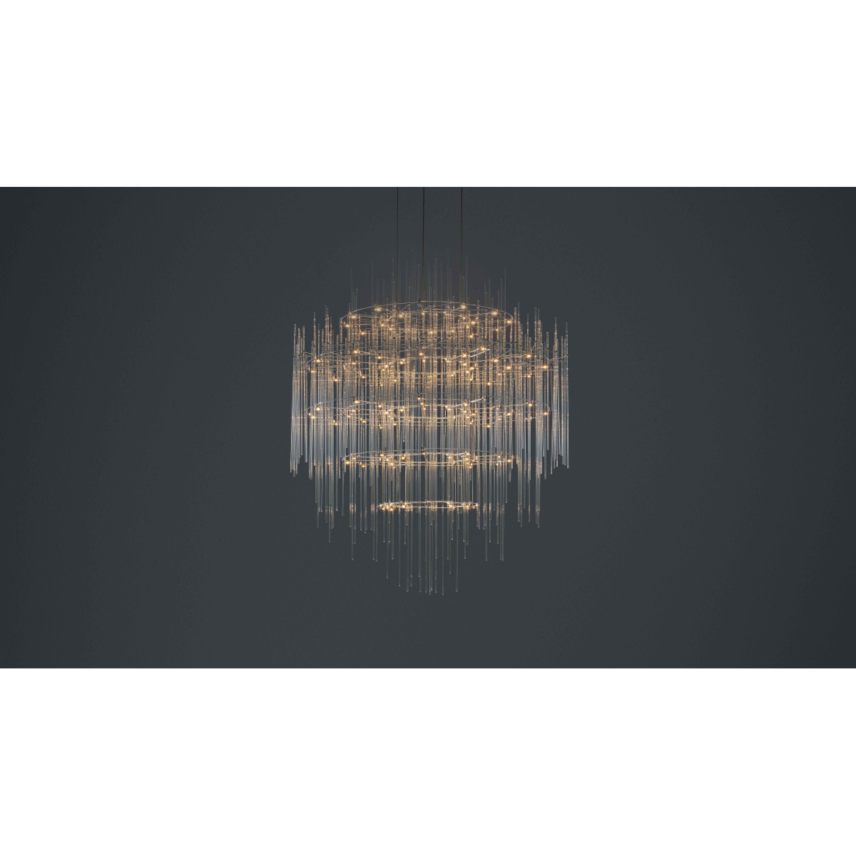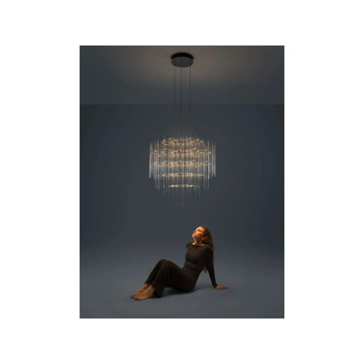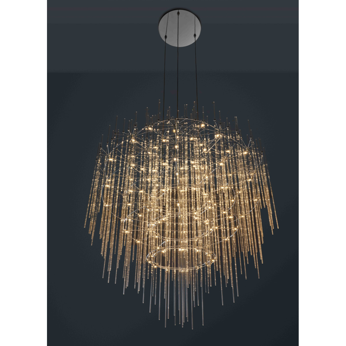 SKYFALL is a glass pendant lamp.‎ The design of SKYFALL stems from the idea of looking up at the stars trough raindrops that are frozen in time.‎ The metal rods and the tiny sparkling glass tubes create this cosmic sculpture.‎