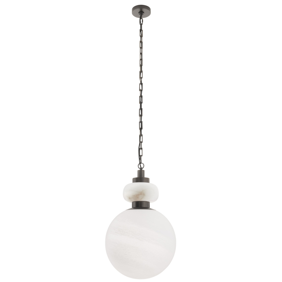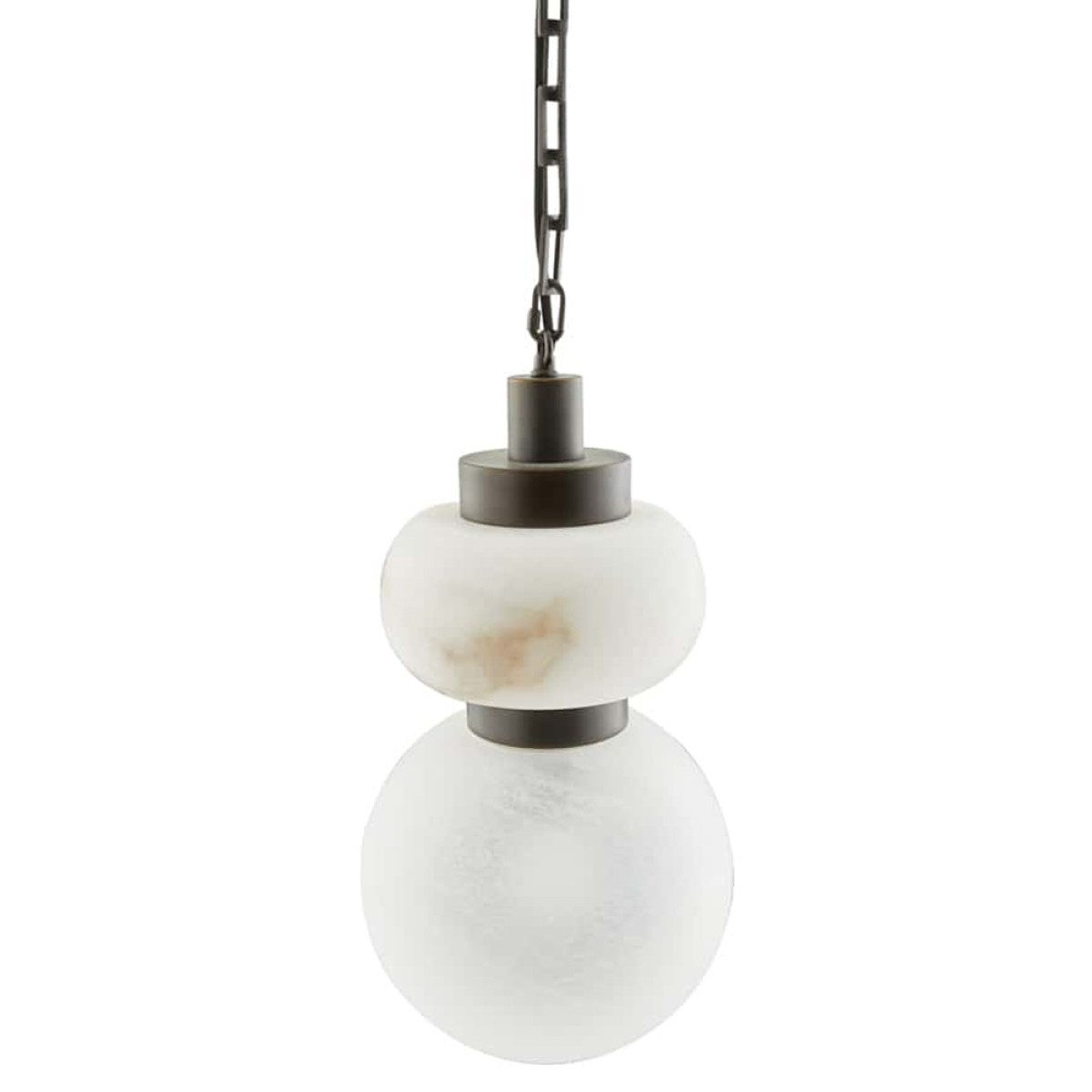 Expertly crafted with totemic silhouette, the Arteriors Home Rosemont Pendant in Matte Swirl Glass and White Alabaster exudes a gentle radiance, crafted from luxurious white alabaster and matte swirl glass. An English bronze steel band and decorative rectangular chain-links add a touch of elegance.