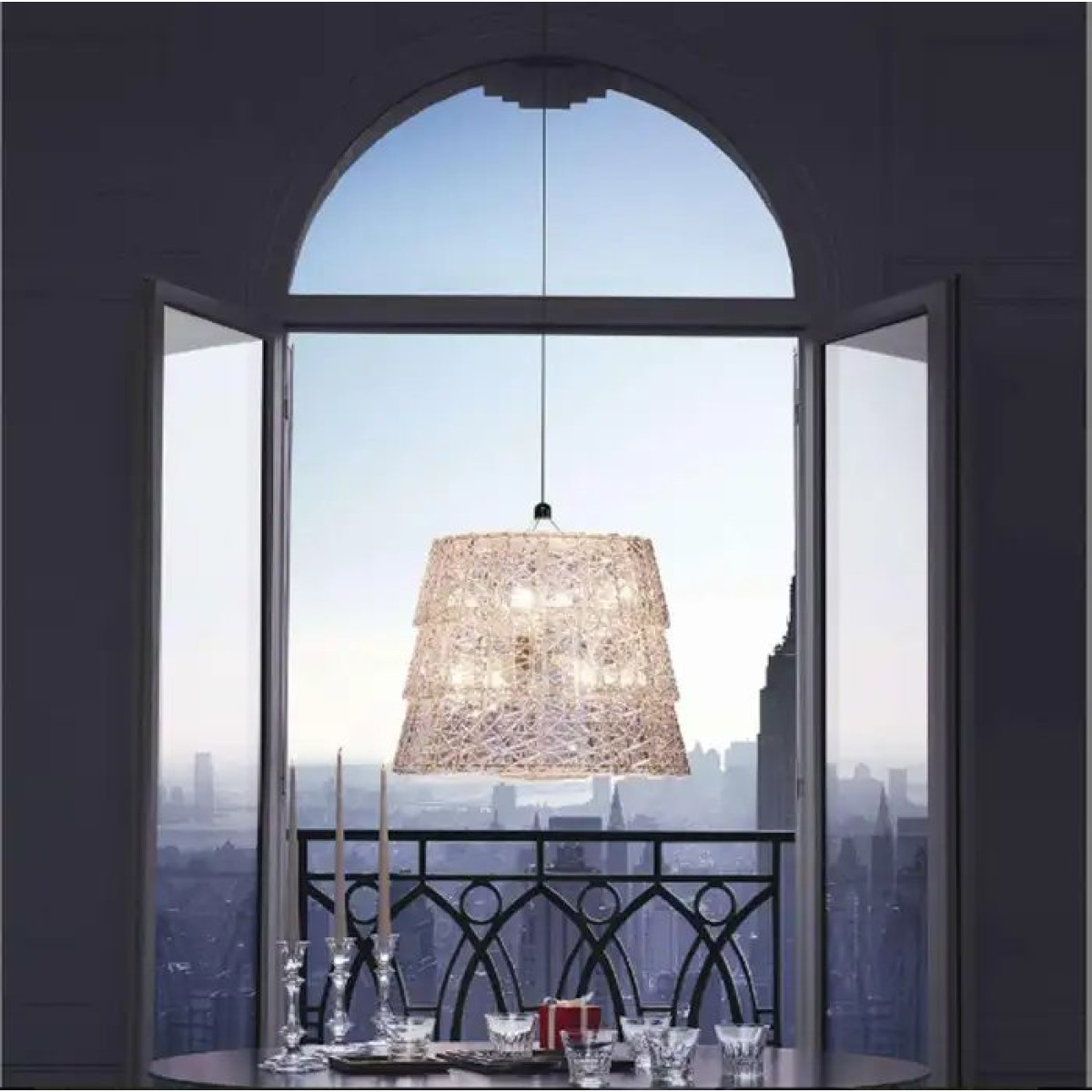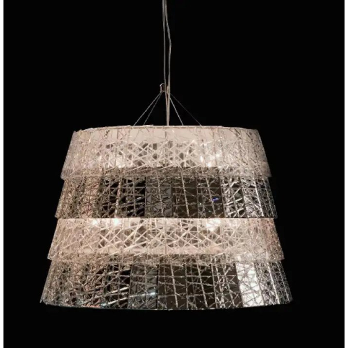 The Tuile De Cristal Frozen Silver chandelier consists of 110 frozen-cut crystal tiles laid on 4 levels on a white finish steel structure. Lighting structure in a white finish stainless steel. A wonderful piece of contemporary design, an eye-catching for every rooms. Diffuser in frosted tempered glass with a cut clear crystal cup. Canopy in shiny anodized aluminium covered with a clear crystal cup. Transparent electric cable. 5 zinc-coated steel cables, including one going to the canopy.
