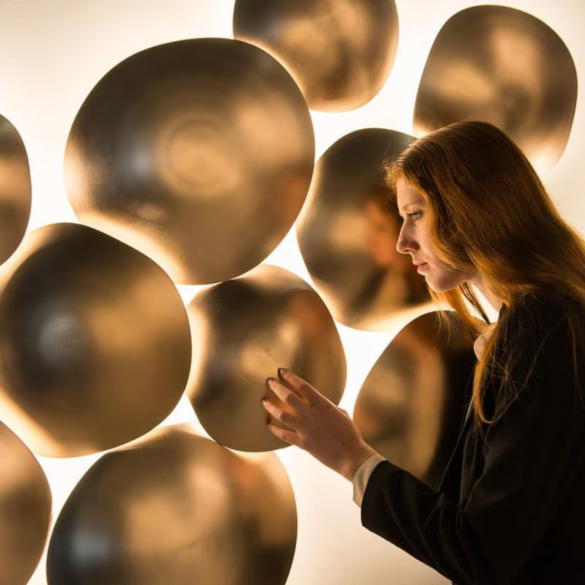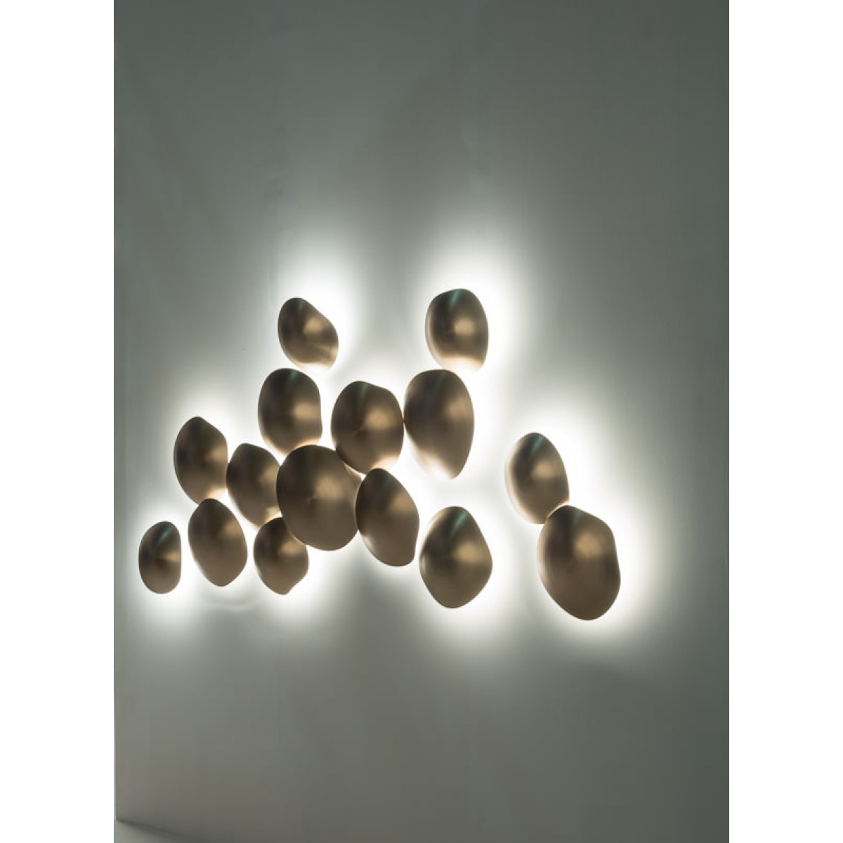 Chestnut Cluster Wall Light, by Alan MIzrahi Lighting, is a decorative organic shape in a sweet hand brushed Champagne finish with a white diffuser. This versatile piece can create unique installations on the walls and ceilings of any room or used as decorative art. The angle of each plate can be adjusted individually.