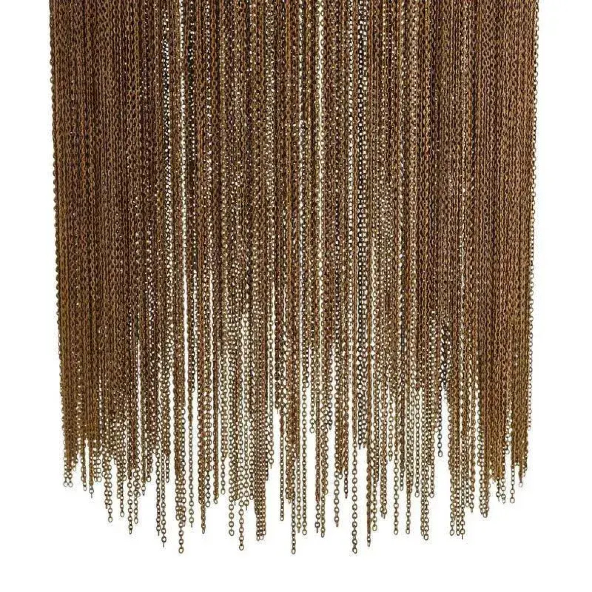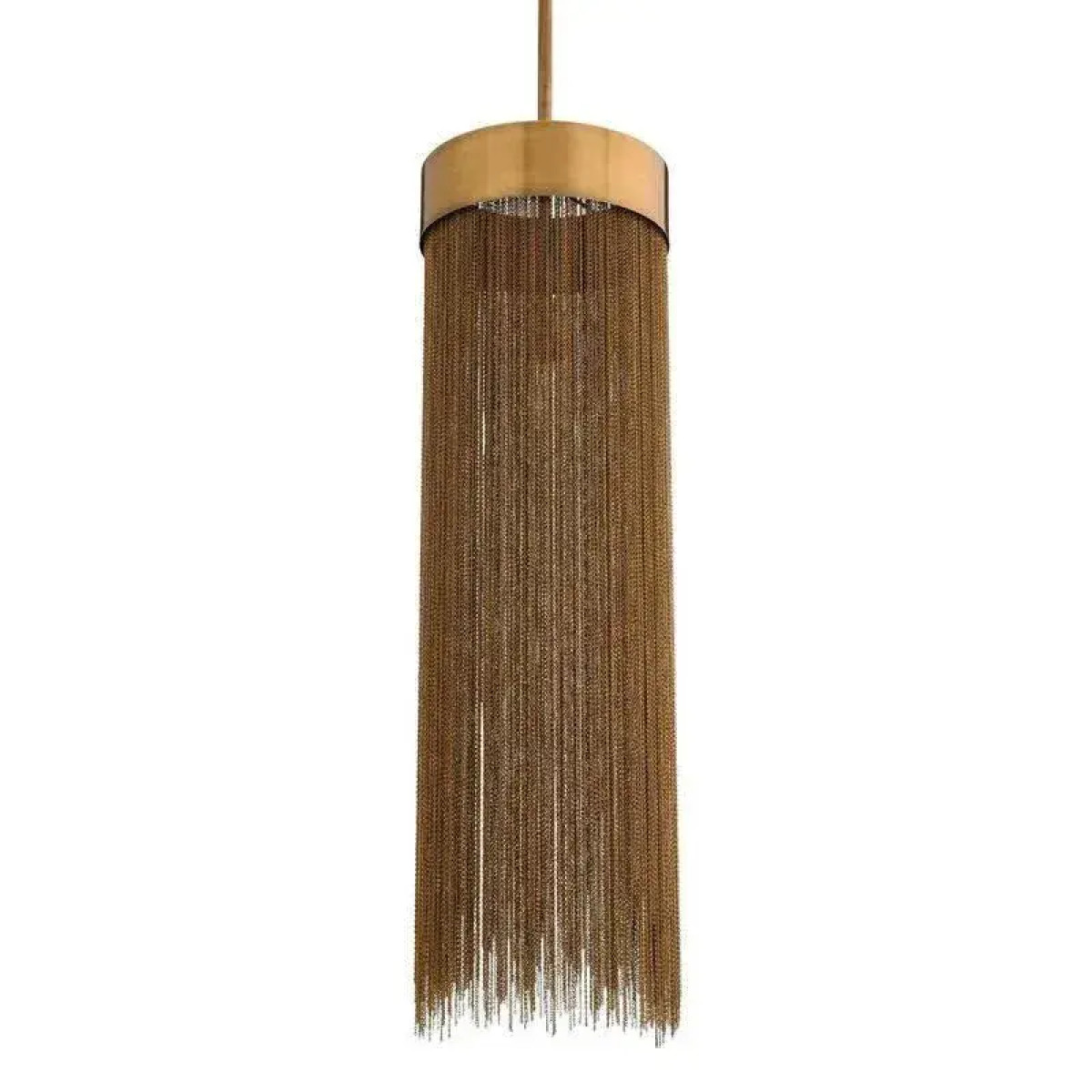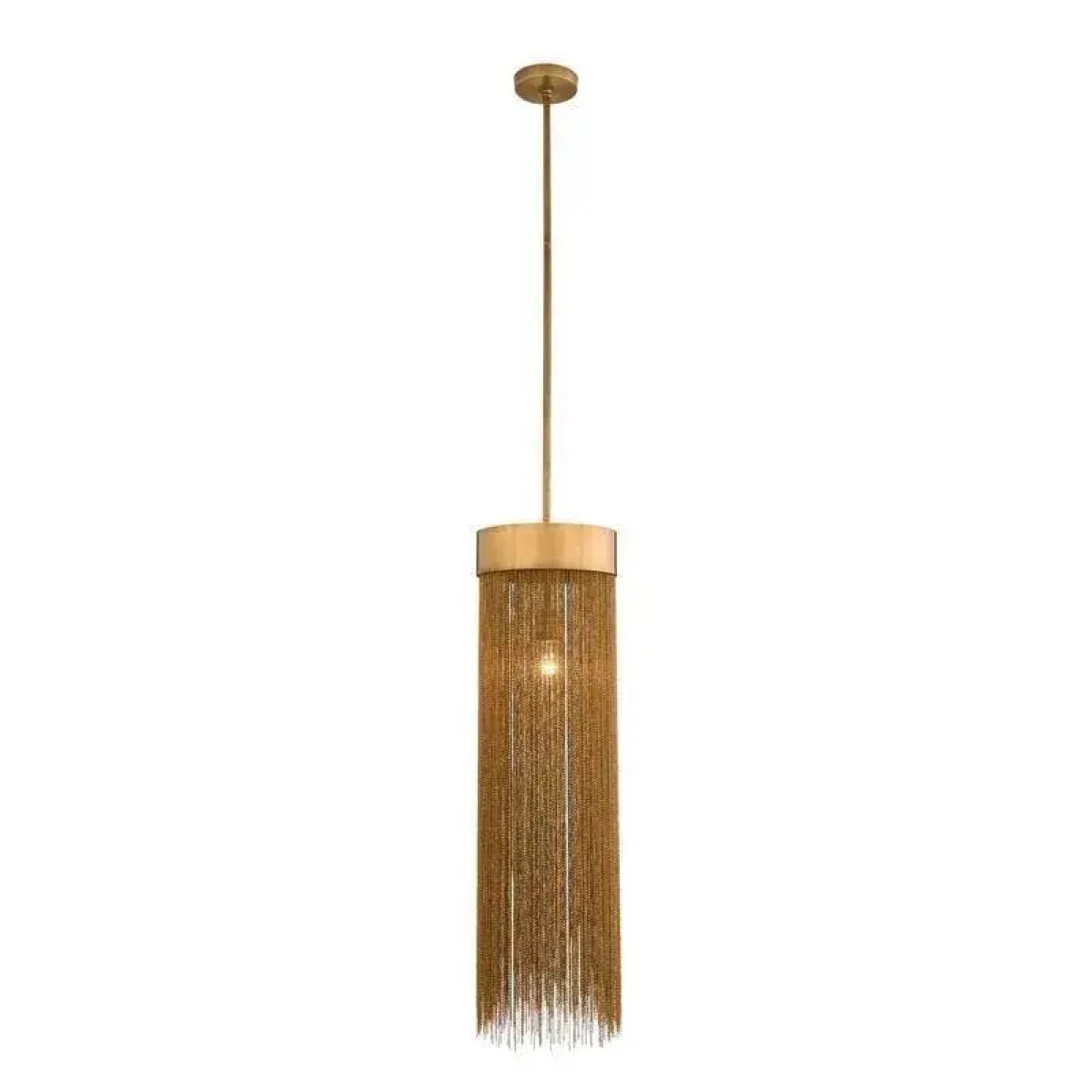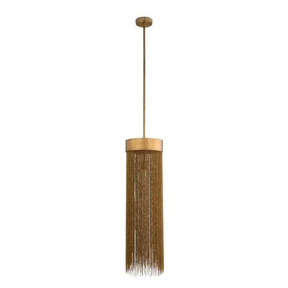 A design derivative of some of our most favored sconces this pendant exudes Hollywood Regency style. Artistically dangling from a thick brass band are rows of delicate vintage brass chains that are almost jewelry-esque. When in use this piece notonly adds light and luster to a space its tassel-like design gently breaks up the light to create subtle shadowplay. finish will vary. Additional pipe available (PIPE-452) Damp-rated, although limited covered outdoor conditions may affect finish.