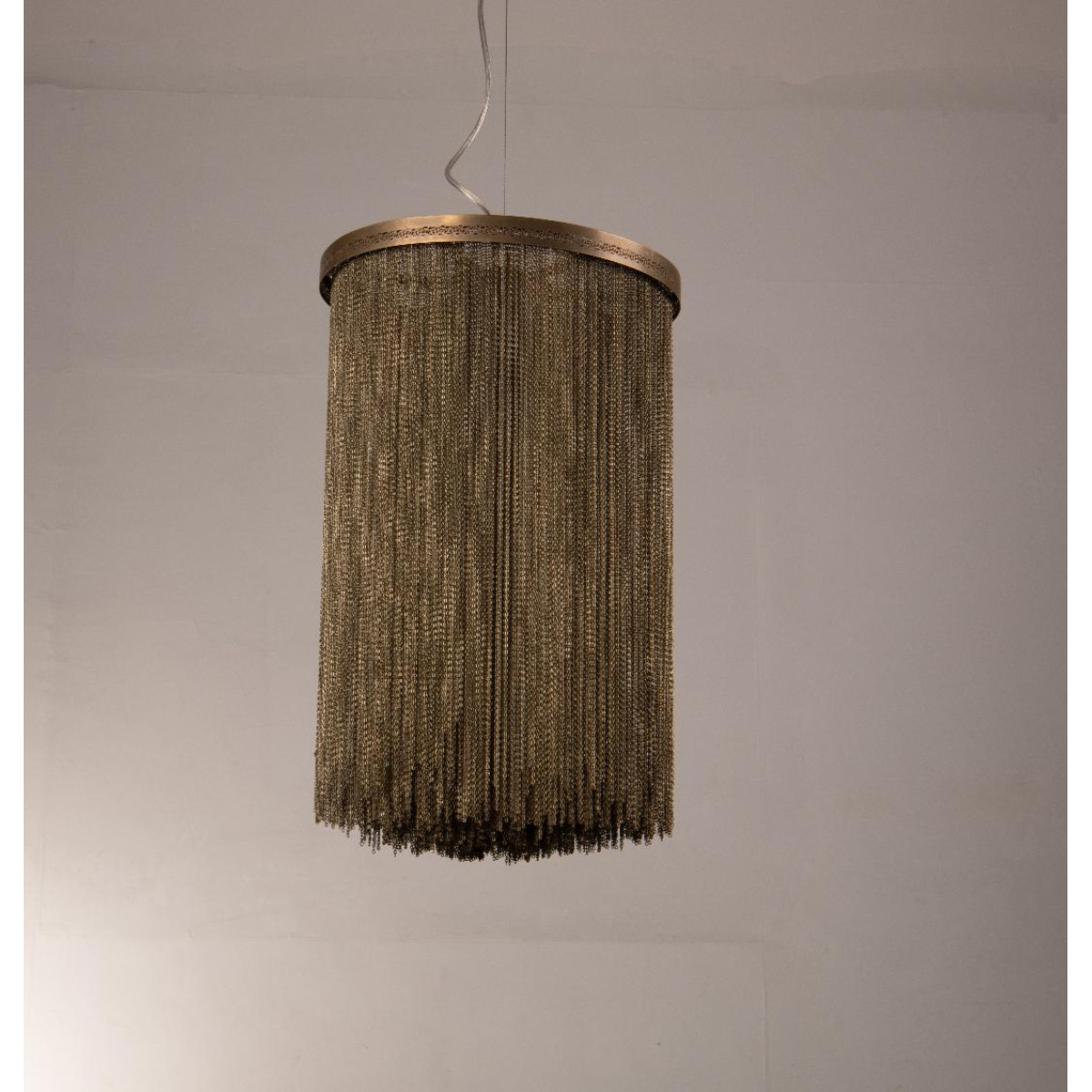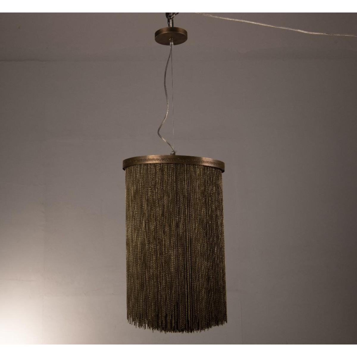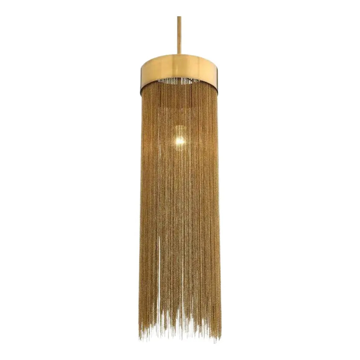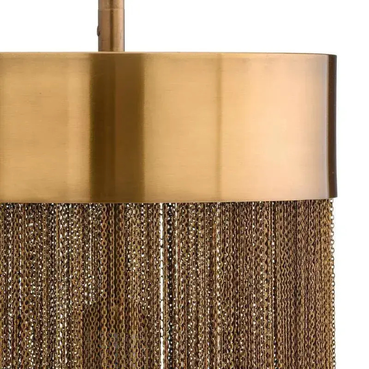 A design derivative of some of our most favored sconces this pendant exudes Hollywood Regency style. Artistically dangling from a thick brass band are rows of delicate vintage brass chains that are almost jewelry-esque. When in use this piece notonly adds light and luster to a space its tassel-like design gently breaks up the light to create subtle shadowplay. finish will vary. Additional pipe available (PIPE-452) Damp-rated, although limited covered outdoor conditions may affect finish.