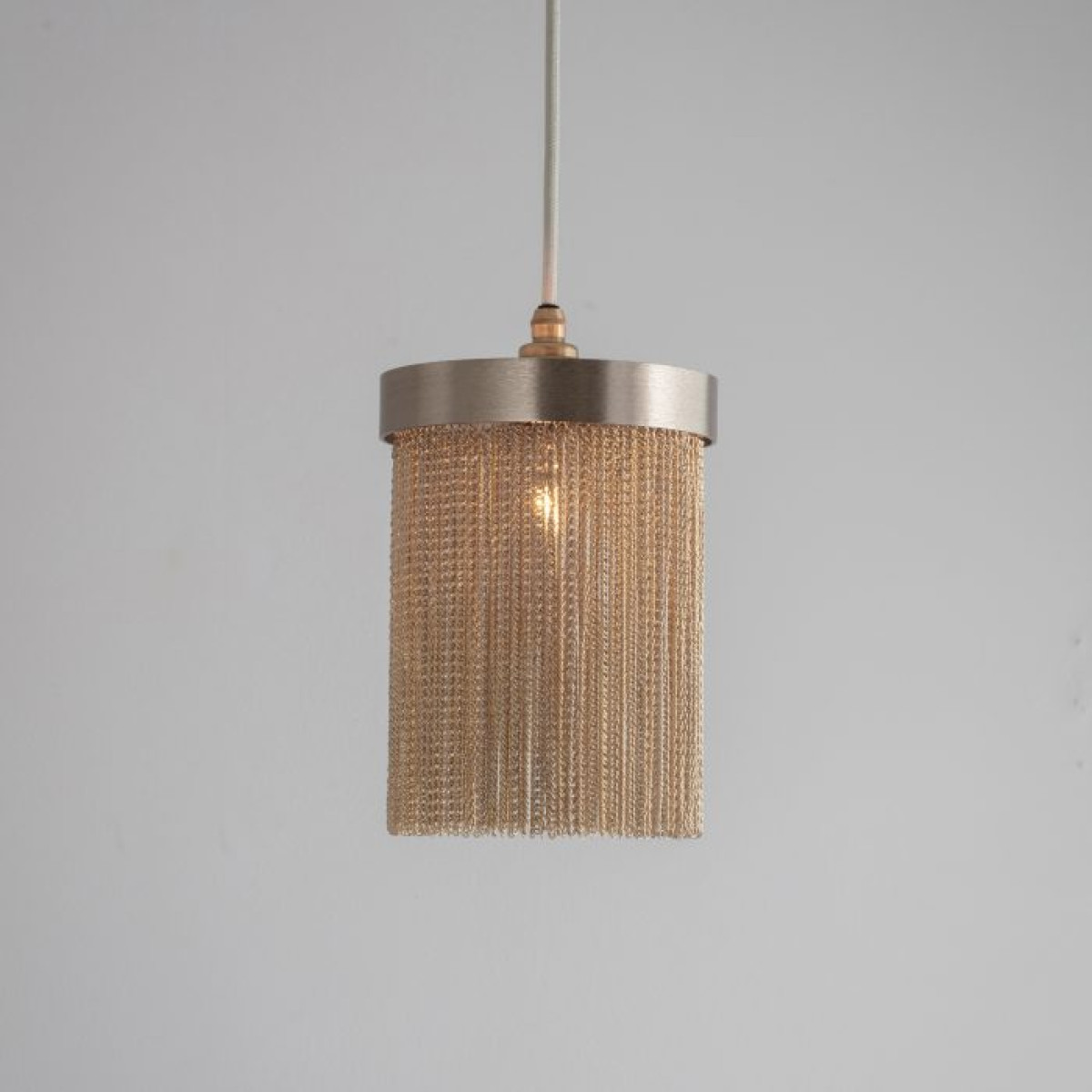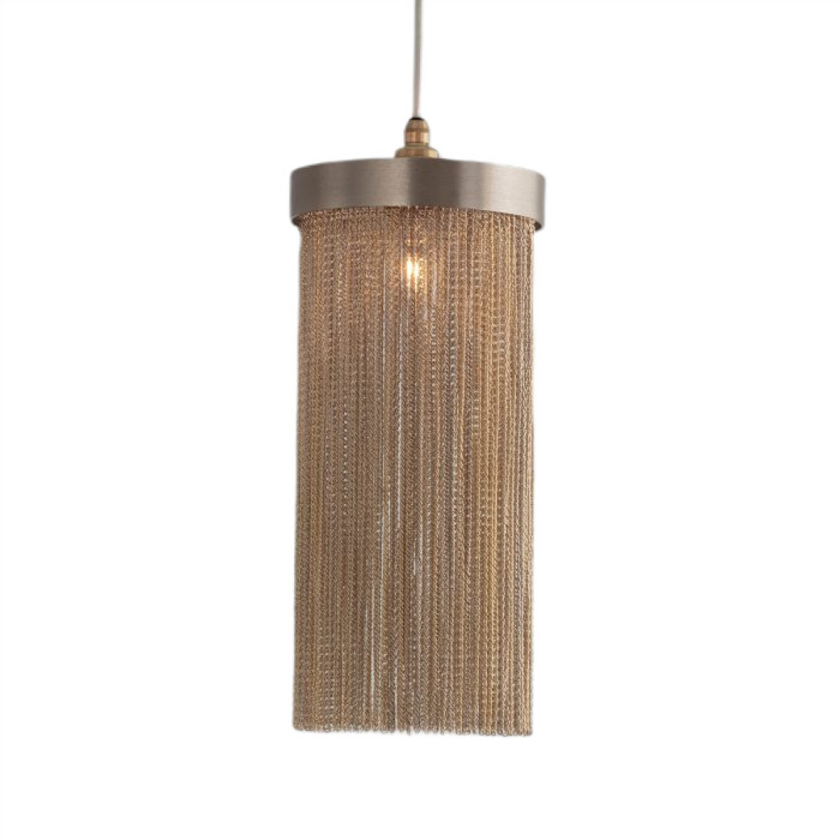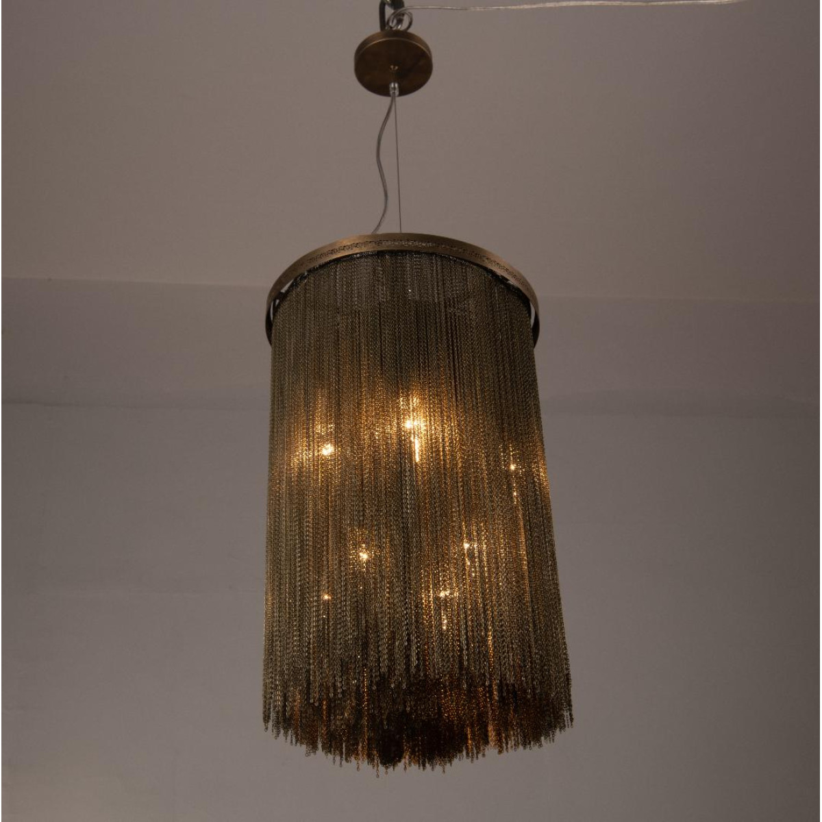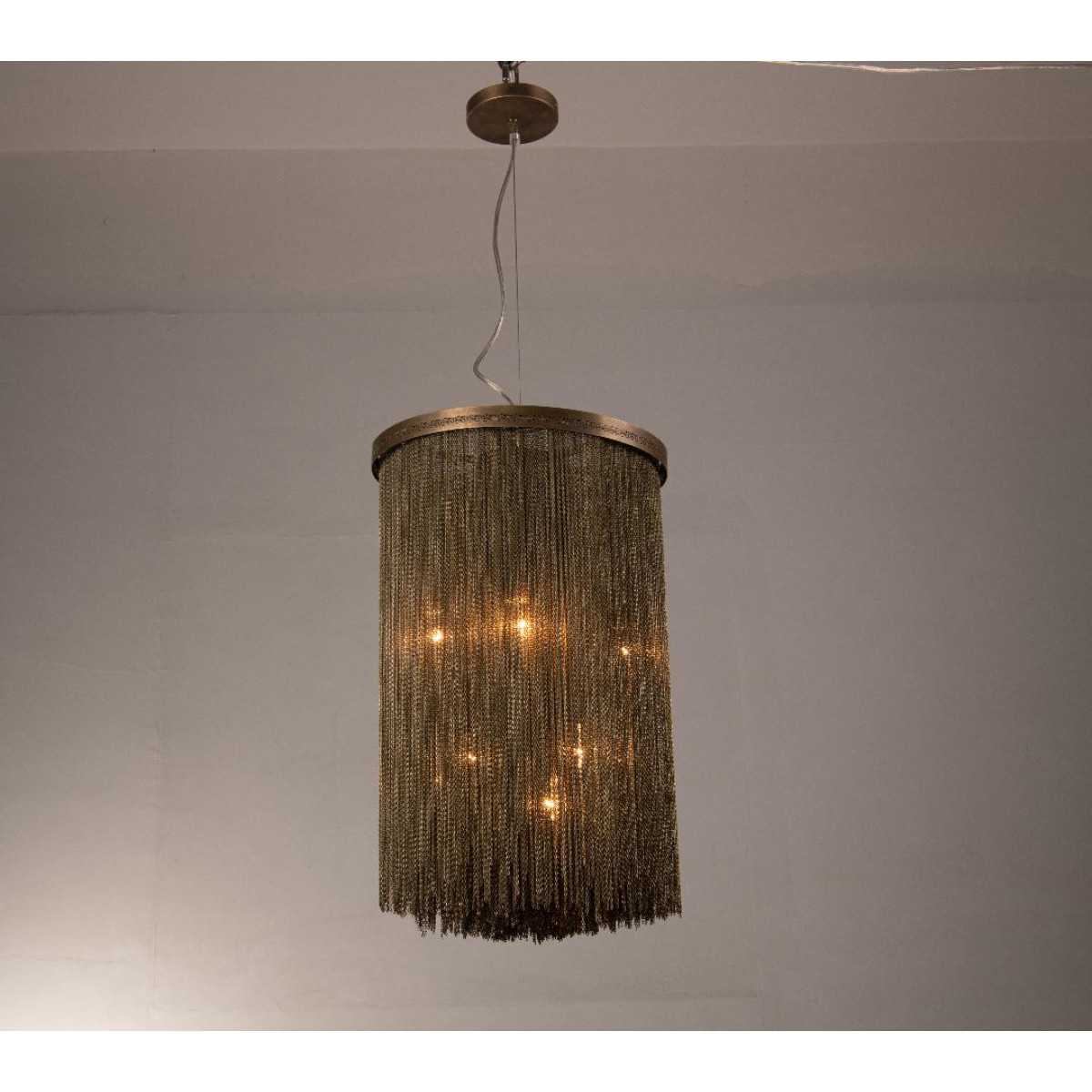 A design derivative of some of our most favored sconces this pendant exudes Hollywood Regency style. Artistically dangling from a thick brass band are rows of delicate vintage brass chains that are almost jewelry-esque. When in use this piece notonly adds light and luster to a space its tassel-like design gently breaks up the light to create subtle shadowplay. finish will vary. Additional pipe available (PIPE-452) Damp-rated, although limited covered outdoor conditions may affect finish.
