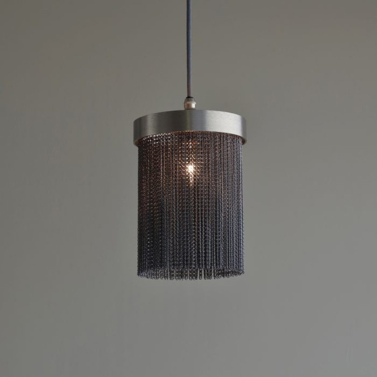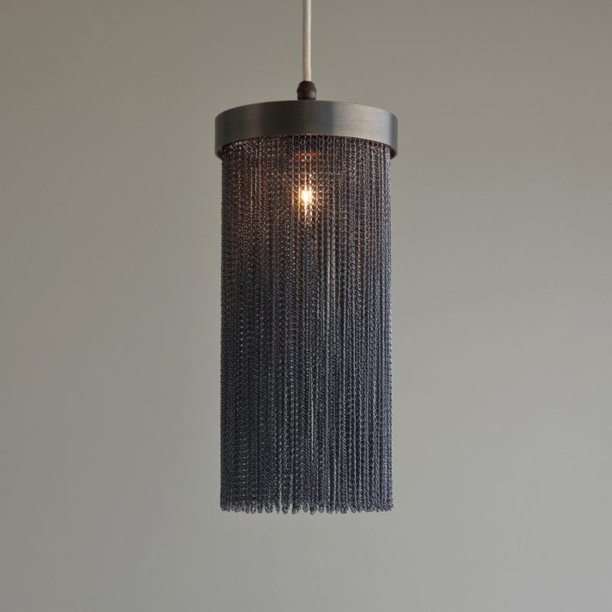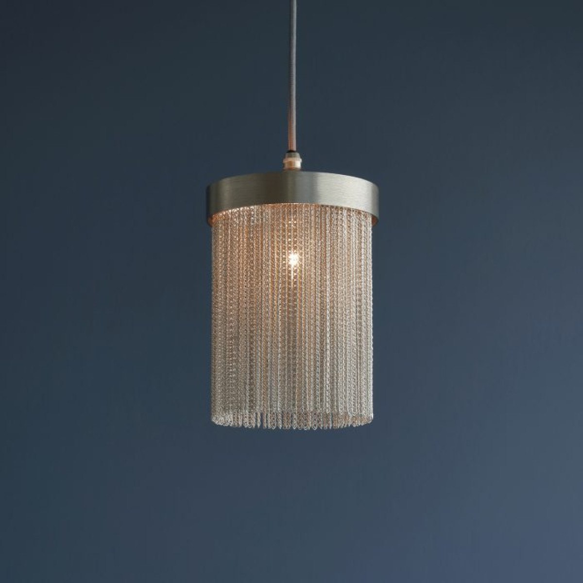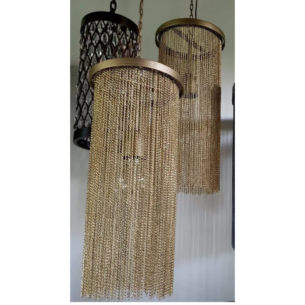 A design derivative of some of our most favored sconces this pendant exudes Hollywood Regency style. Artistically dangling from a thick brass band are rows of delicate vintage brass chains that are almost jewelry-esque. When in use this piece notonly adds light and luster to a space its tassel-like design gently breaks up the light to create subtle shadowplay. finish will vary. Additional pipe available (PIPE-452) Damp-rated, although limited covered outdoor conditions may affect finish.