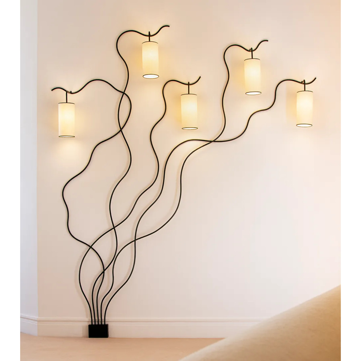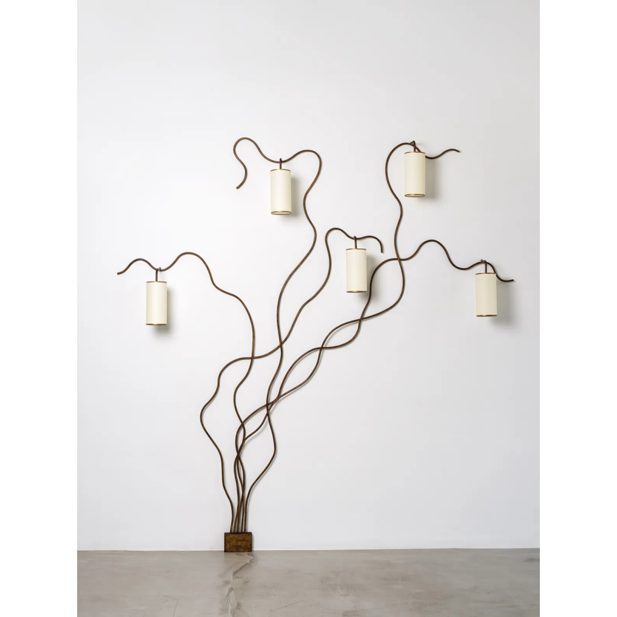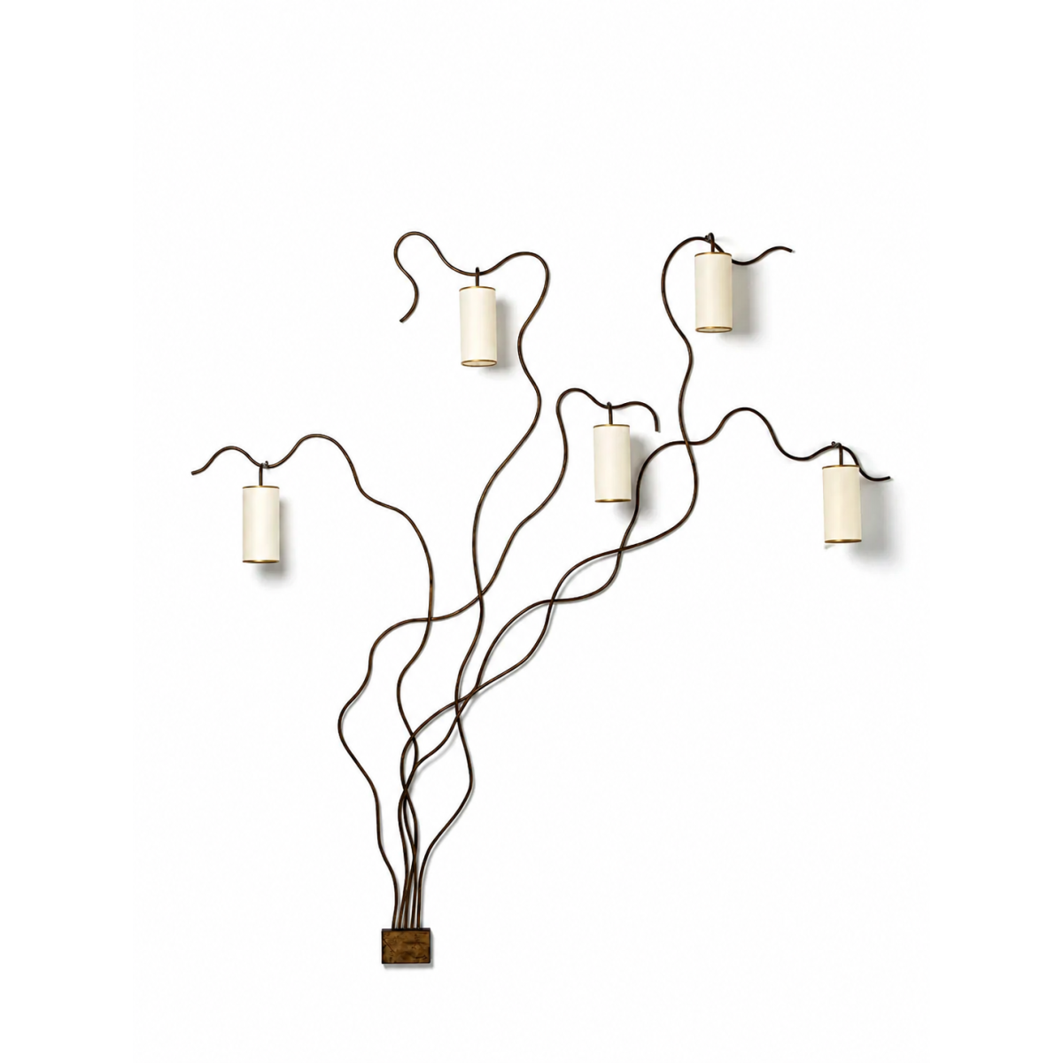The Liane, a significant piece in the oeuvre of Royere, held in the collection at the Musée des Arts Décoratifs, embodies the essence of Royere’s work. As if growing across the wall, undulating lines, organic yet balanced, drawn on a blank slate, sprout a series of lamps as if blossoms on the branch. All superfluous detail is reduced and one is left only with a gesture of the hand.