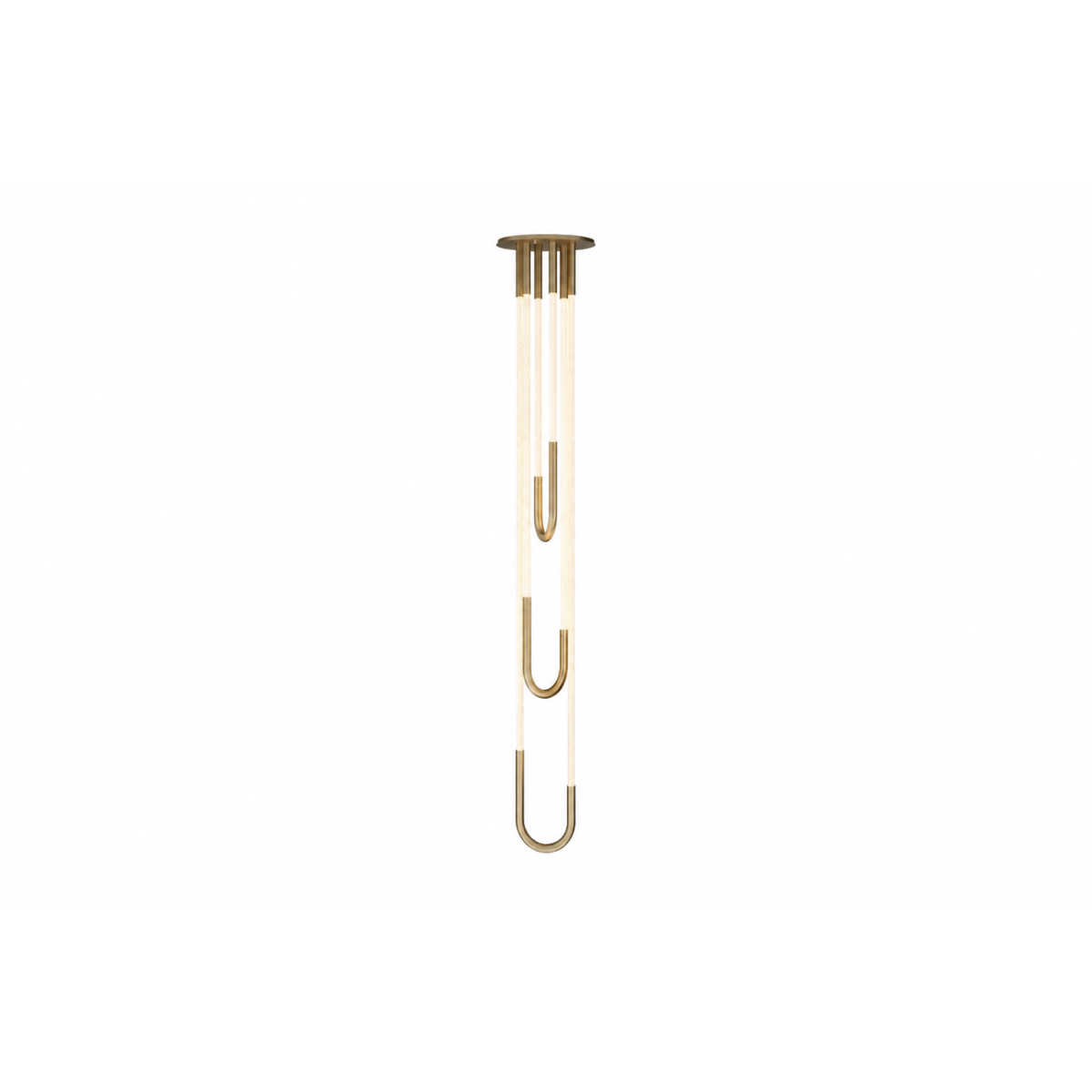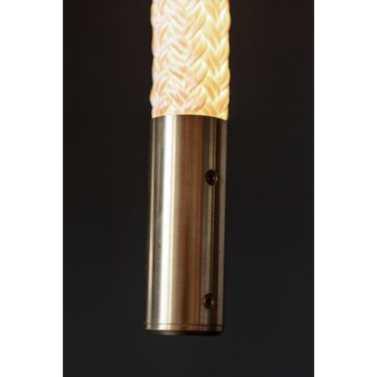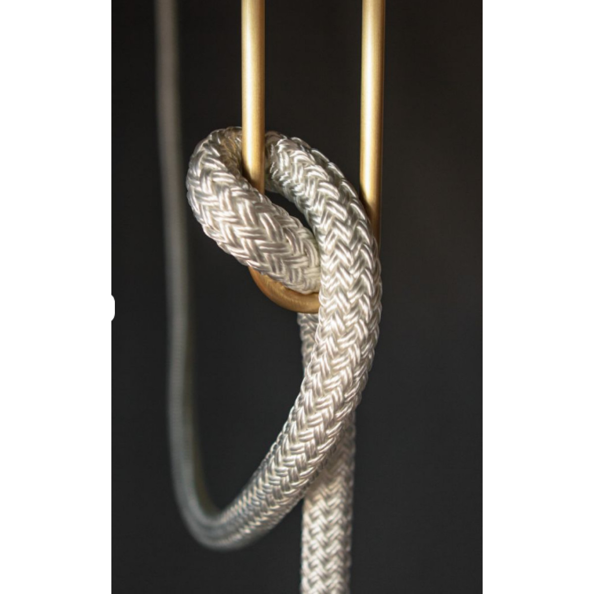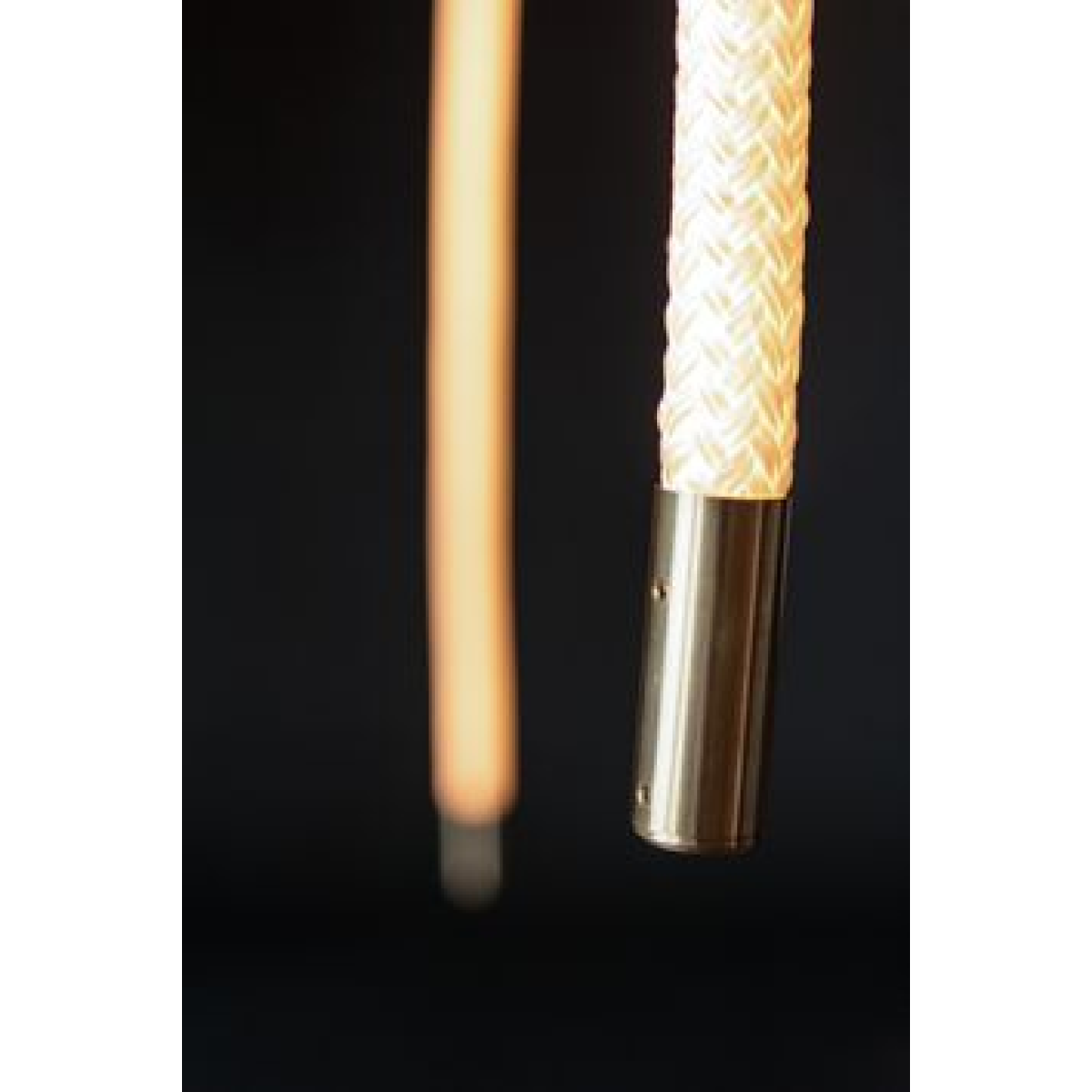This capsule pendant features a refined satin brass frame paired with vertical rope elements that give it a soft, textured look. The rope sections replace traditional tubes, diffusing the light gently to create a warm and inviting glow. Sculptural brass loops add a modern artistic touch, making it both minimal and visually striking.