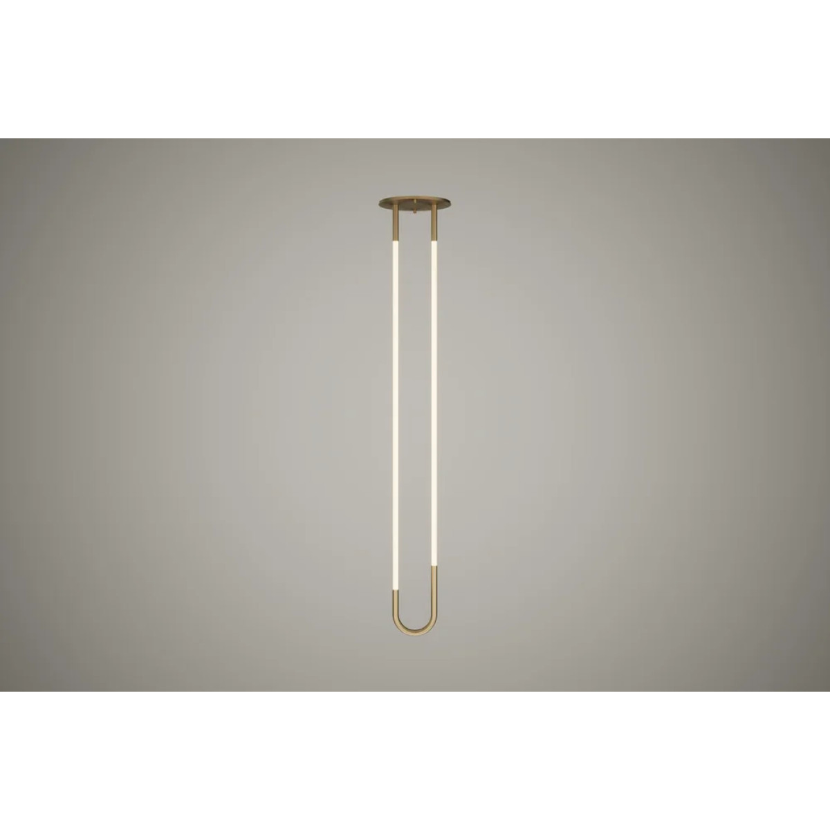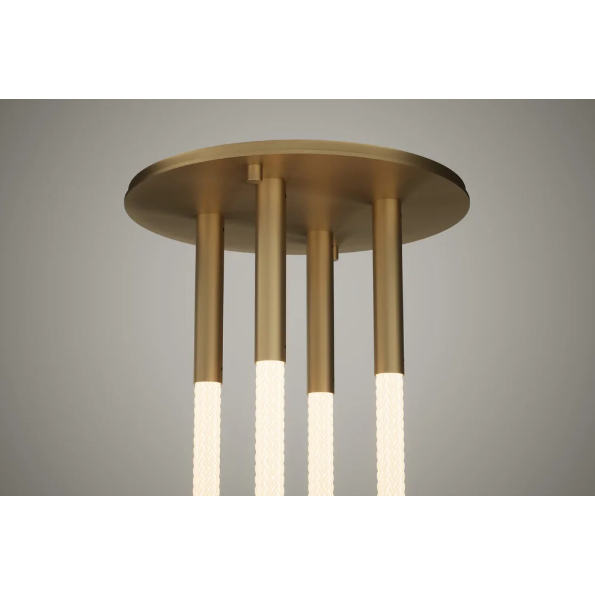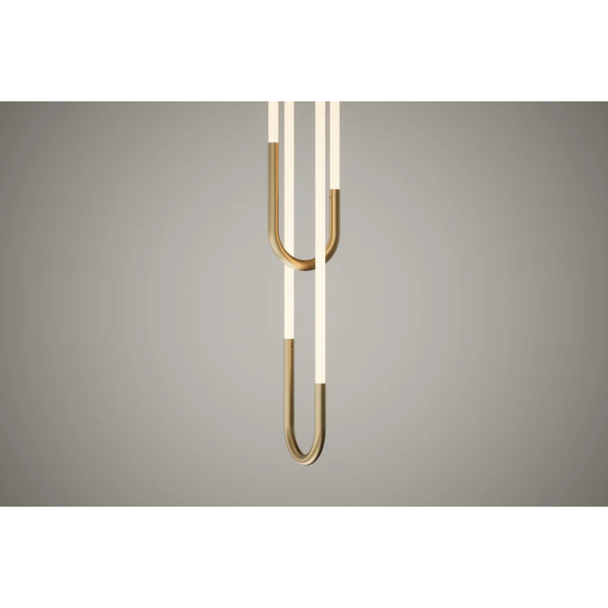 This capsule pendant features a refined satin brass frame paired with vertical rope elements that give it a soft, textured look. The rope sections replace traditional tubes, diffusing the light gently to create a warm and inviting glow. Sculptural brass loops add a modern artistic touch, making it both minimal and visually striking.