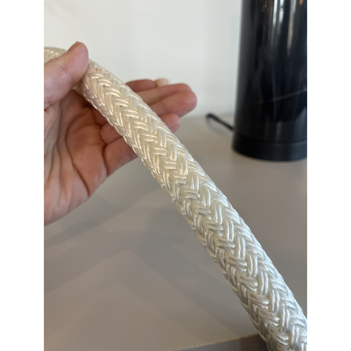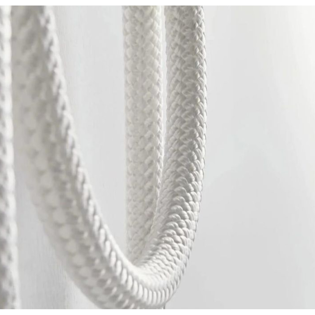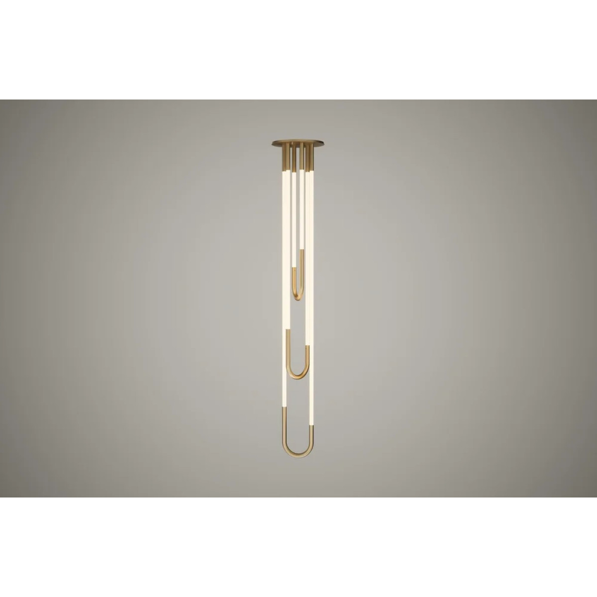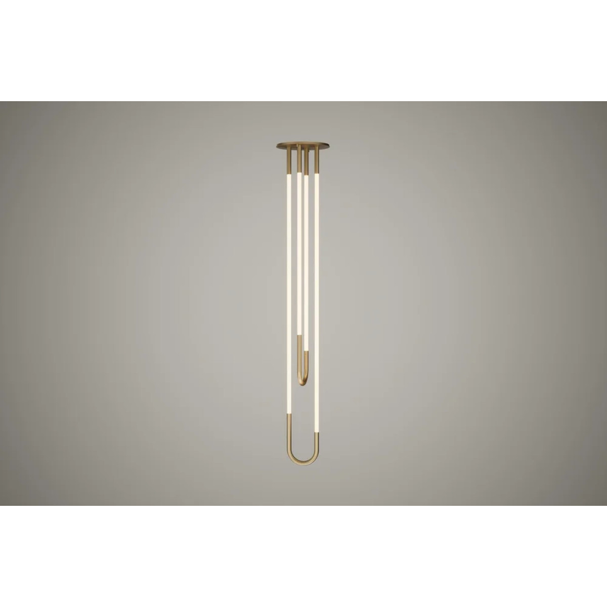 This capsule pendant features a refined satin brass frame paired with vertical rope elements that give it a soft, textured look. The rope sections replace traditional tubes, diffusing the light gently to create a warm and inviting glow. Sculptural brass loops add a modern artistic touch, making it both minimal and visually striking.