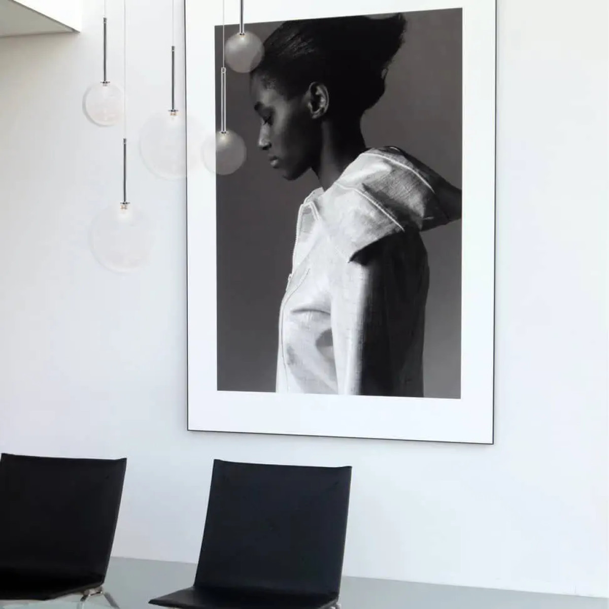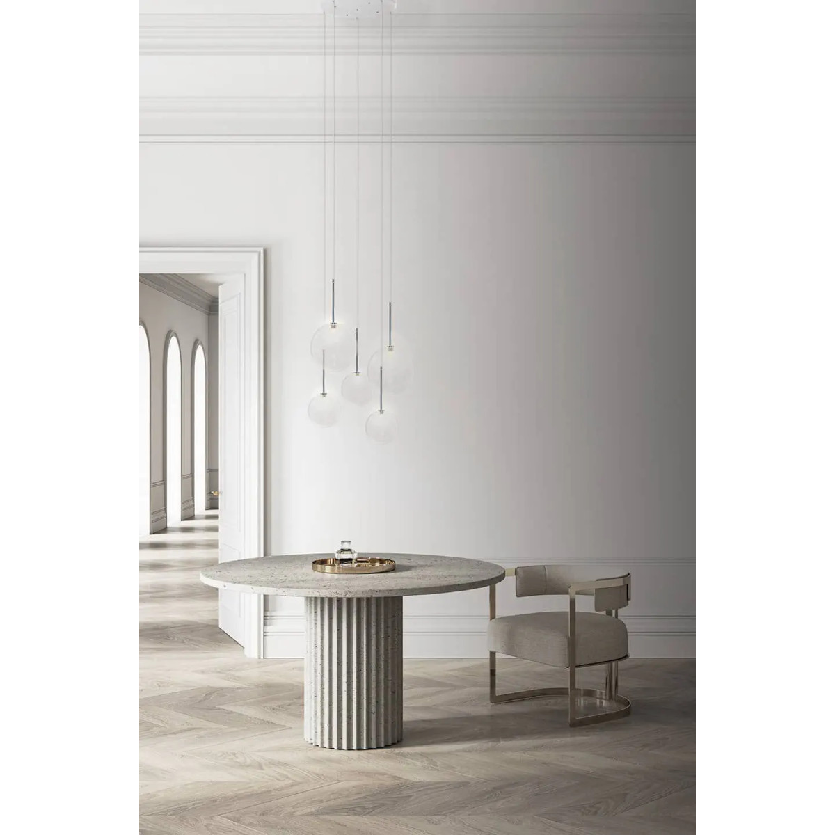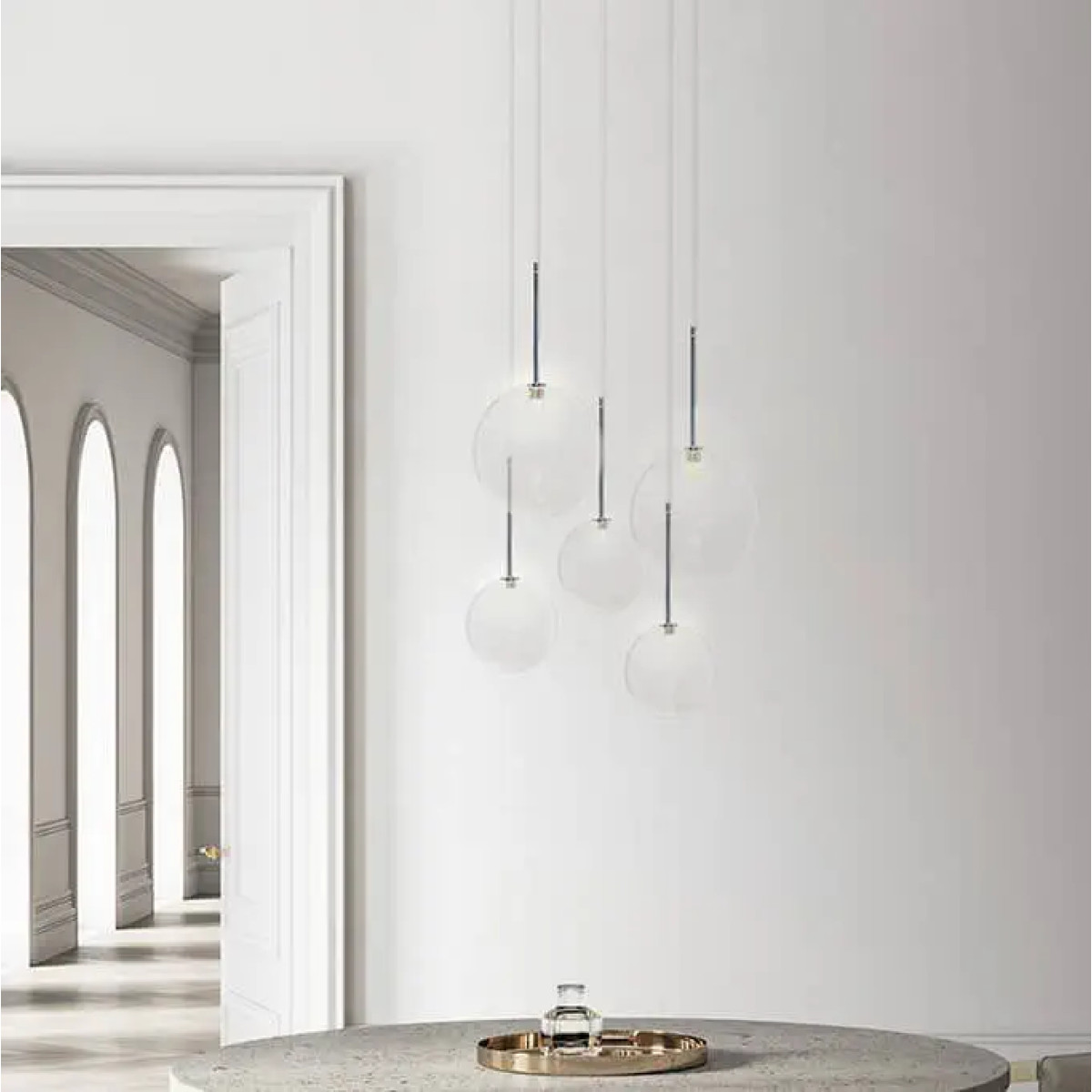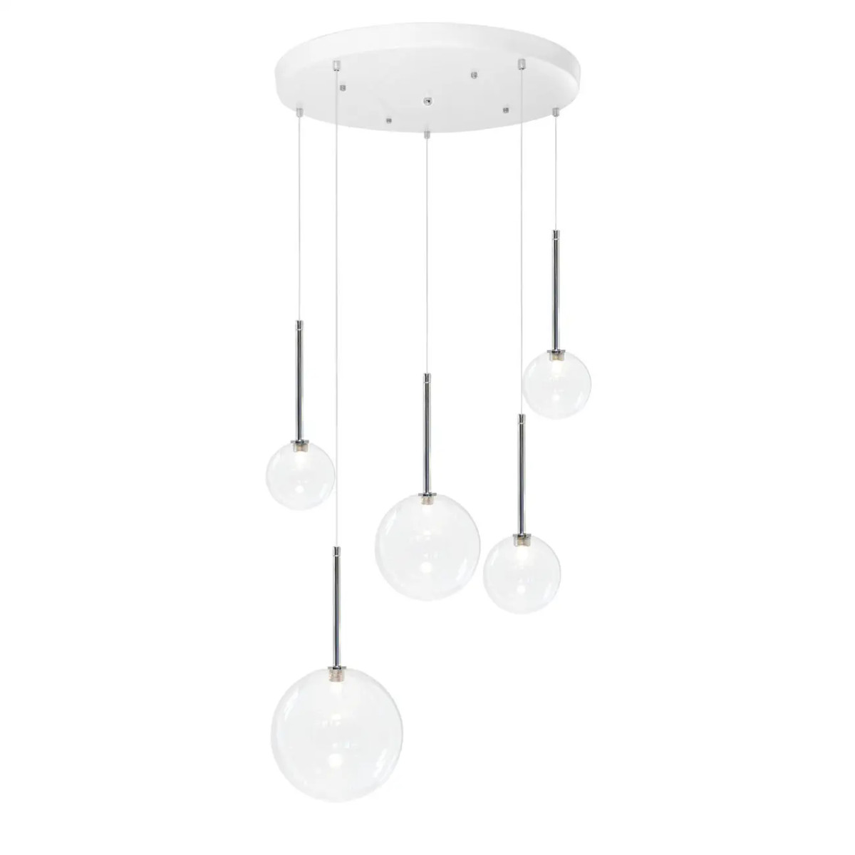 Delicate in appearance, the optically rich glass bubbles are hand blown and dented for optimal light reflection. Lamp with glass support lacquered in white or black and suspended clear smooth borosilicate glass spheres with halogen bulbs inside. Custom bubble colors are available. This design is extremely versatile to fit any space and décor. All aspects can be customized including hardware, finish, dimension (including dramatic overall height), and the most current LED illumination options.