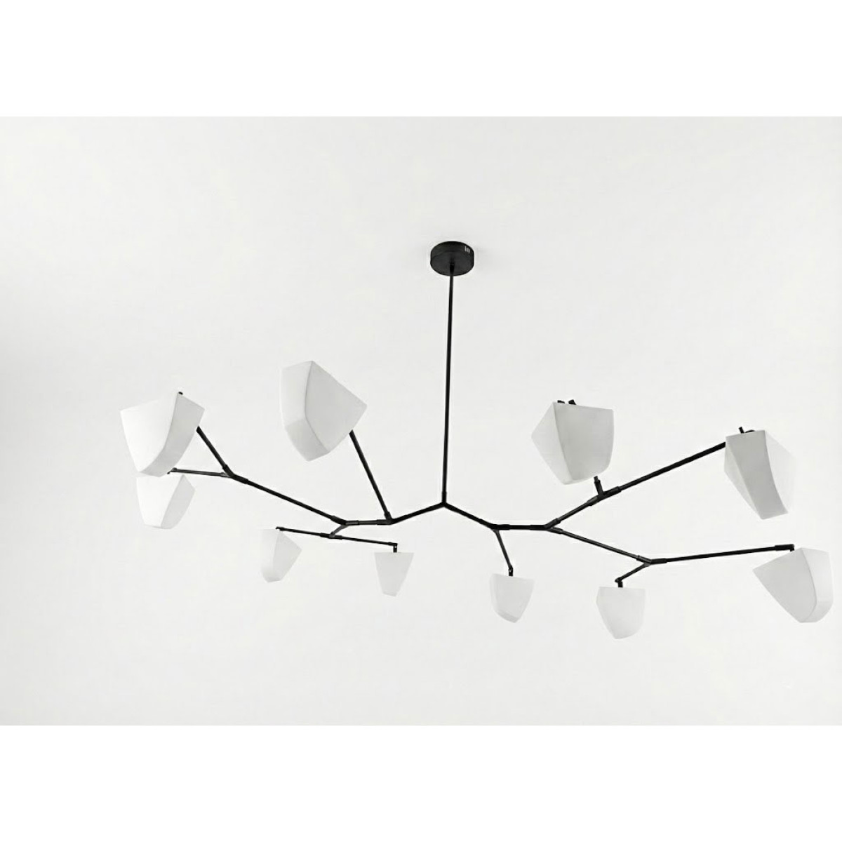 Cassiopeia Chandelier is a large horizontal mobile chandelier with thirteen handmade translucent porcelain polyhedrons and three hanging points. This special version of the Cassiopeia Series was designed to float horizontally extending in two directions, and it demonstrates the flexibility of our proprietary hanging system. The intention was to create a modern chandelier that would defy expectations by also being a unique, abstract floating sculpture. When turned off, the polyhedrons appear solid, but when turned on they transform into glowing light bodies. The Cassiopeia Series is designed for spaces with lower ceiling heights, where a horizontal chandelier is ideal. Cassiopeia 6 offers numerous variations and can be customized in size and finish. The proprietary frame system utilizes our unique brass tubing to conceal the wires and incorporates specially designed joints to create its distinctive shape. The subtle, almost imperceptible movement of the fixture adds a pleasant animation to the object.