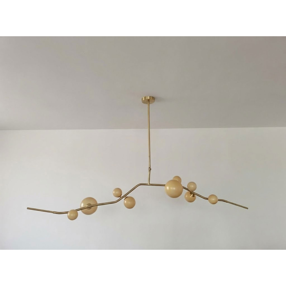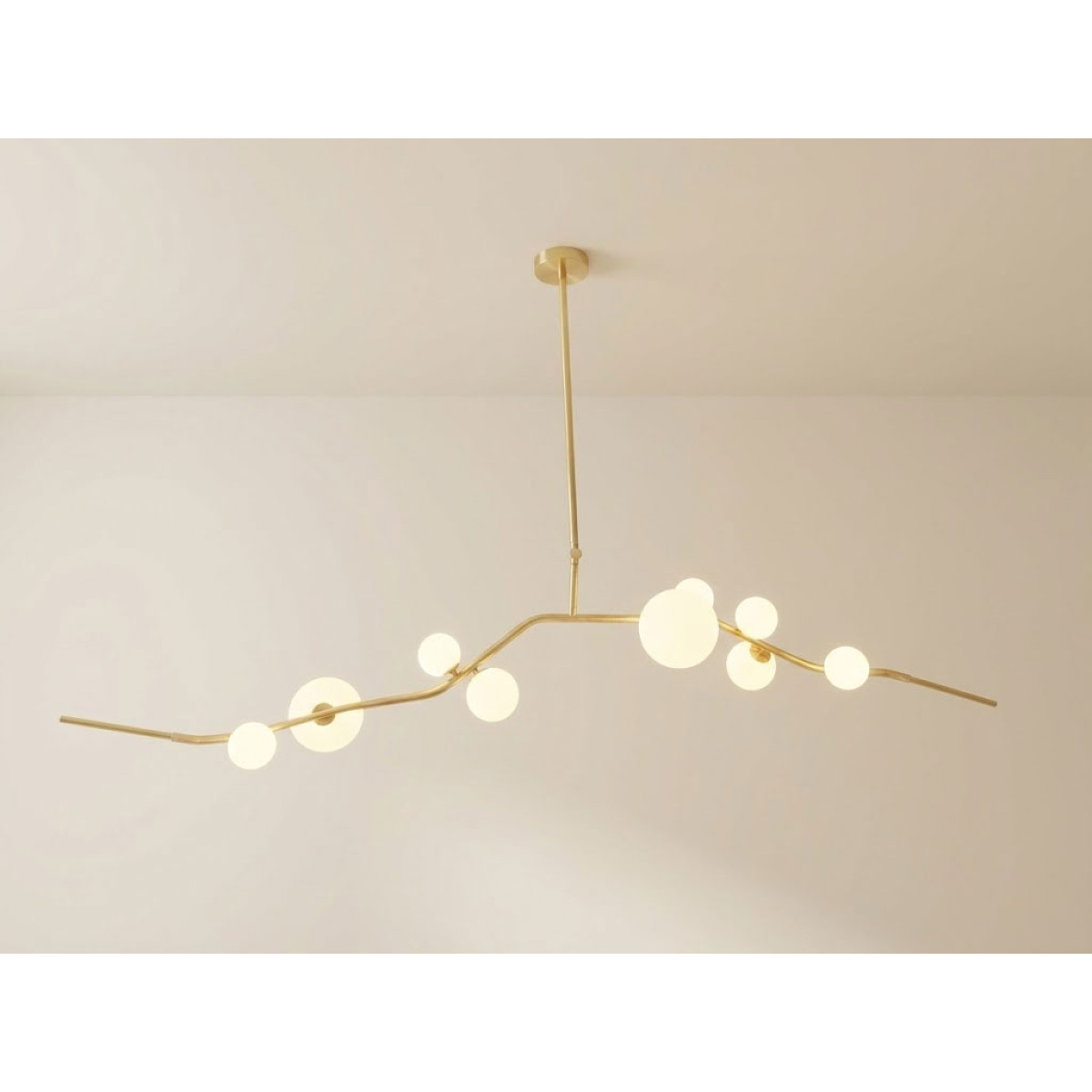 This gives a harmonious balance between effortlessly chic design with an opulent twist. The delicate gold fringing juxtaposes the rigid gold arms and frosted glass, which brings a sense of chaos to space. The Chandelier is available in a 6, 7, 9, or 10 bulb option, and can be hung either alone, to keep it simple and neat, or clustered together to create a luxuriously textured feature in any space. The on-trend brushed gold finish is one of the hottest trends in lighting at the moment, while the gold chains will keep it edgy and different. This is a diverse group of fixtures with dozens of possible configurations and several finishes, unified by the use of small, pale, round globes--yellow, pink, white or blue--burnished with gold foil that gives them a soft, otherworldly glow amid the slender metal branches. From chandeliers that hang above a table like a gentle solar system to the bold yet almost weightless Cherry Bomb cages, which resemble lobster traps freshly pulled from the bay, glistening in the sun, the collection gives expression to a panoply of emotions.