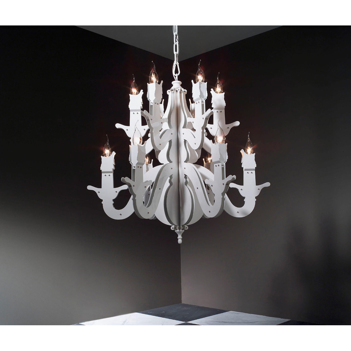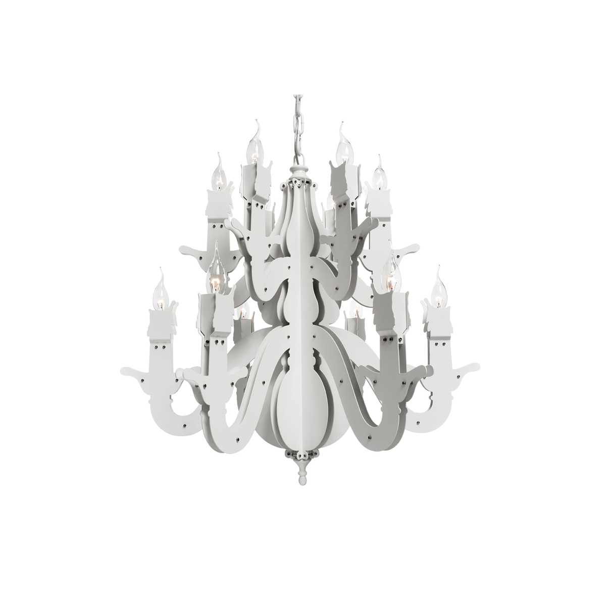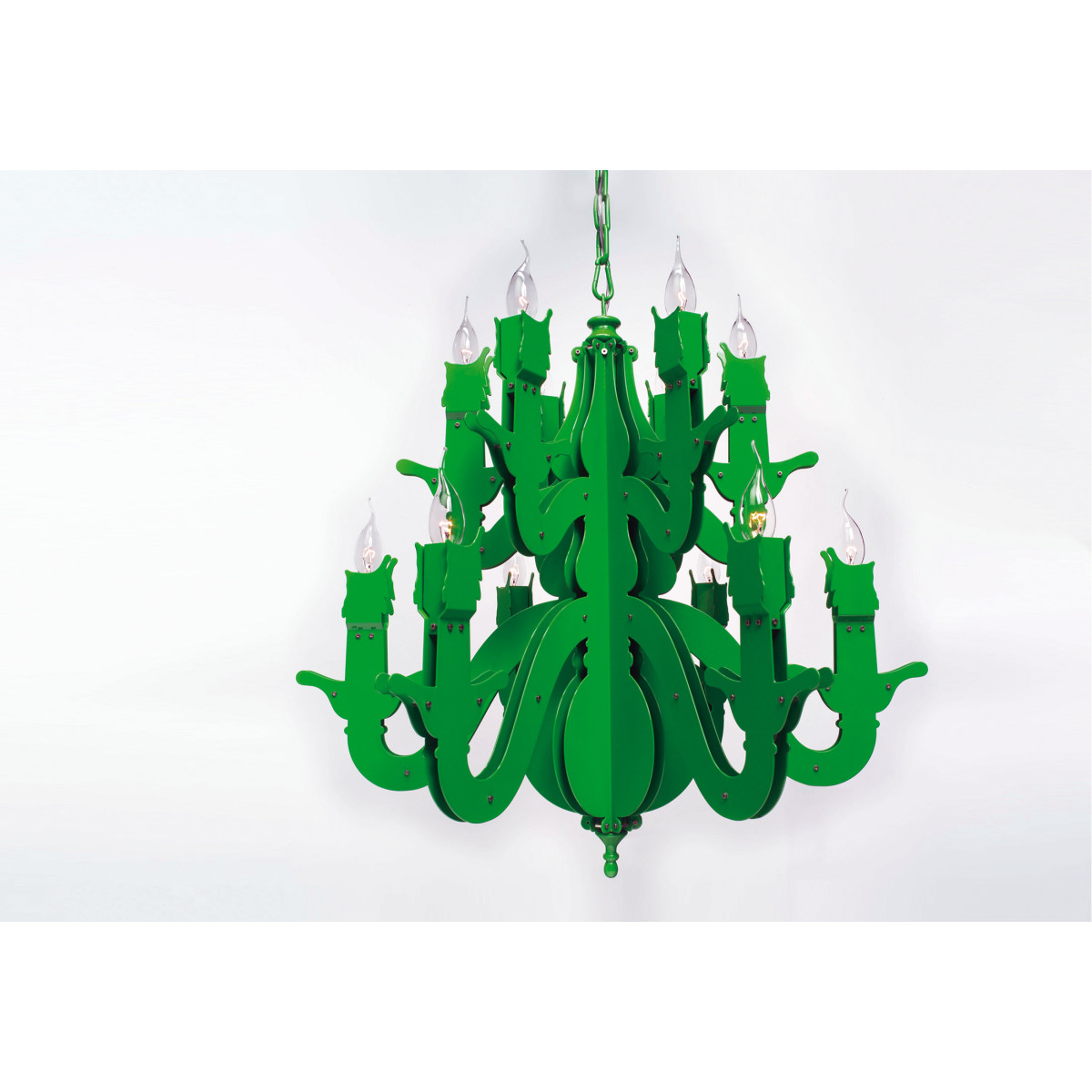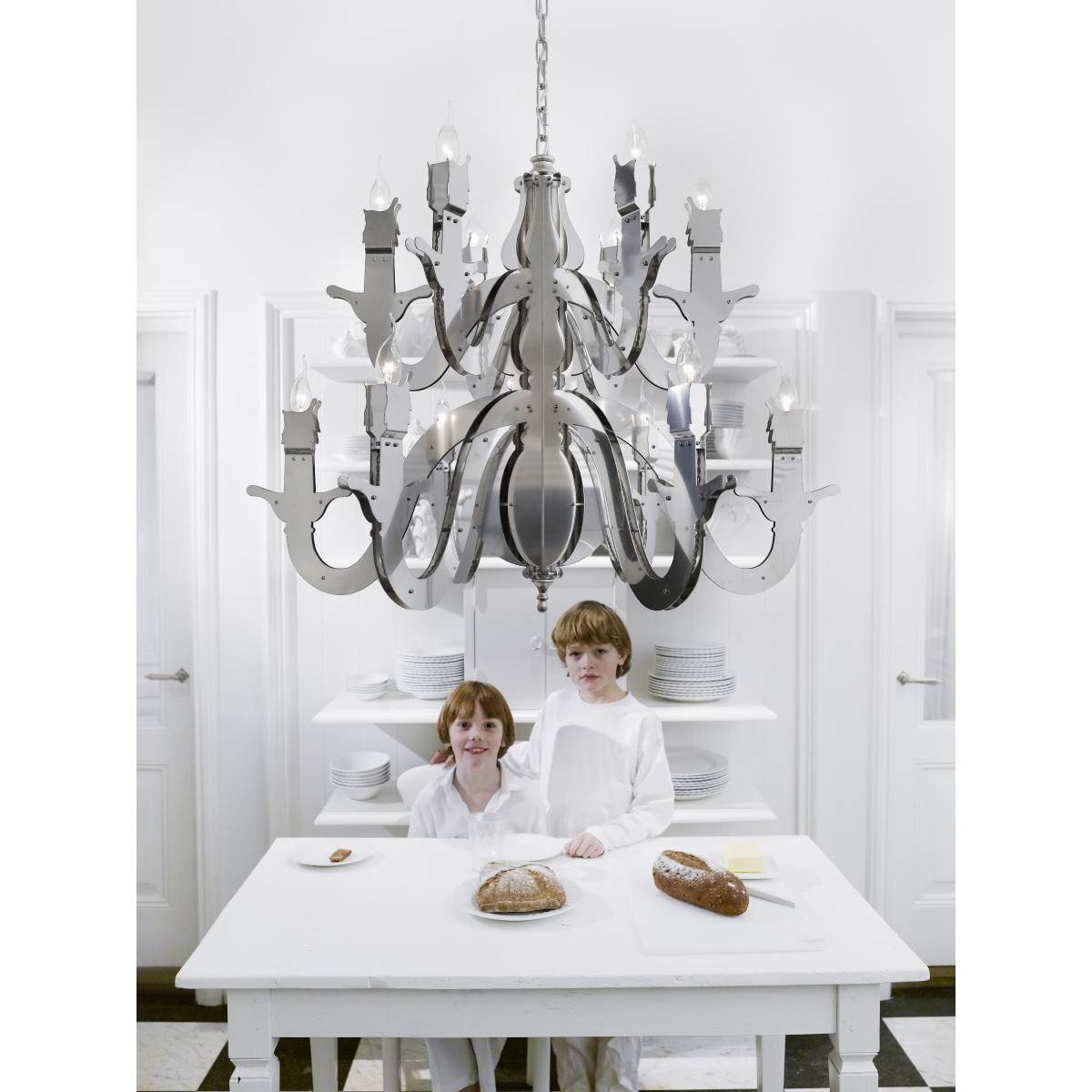 Claire – obscure; mystique and mystery, Rembrandt’s spirit lingers on in the Night Watch, a ‘dressed-down’ chandelier which reaches back to the basic design of the early copper chandelier. Simple and bare, yet glowing and warm,It is tradition into today’s space. The monumental two-dimensional shapes, breathing the 17th century, are handcrafted together with nuts and bolts and powder coated in a range of trendy colors. Past, present and future dissolve into one glowing celebration of the Autonomy of Dutch Design throughout the ages.