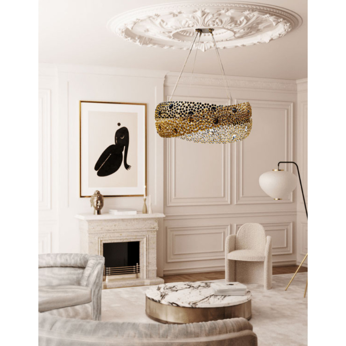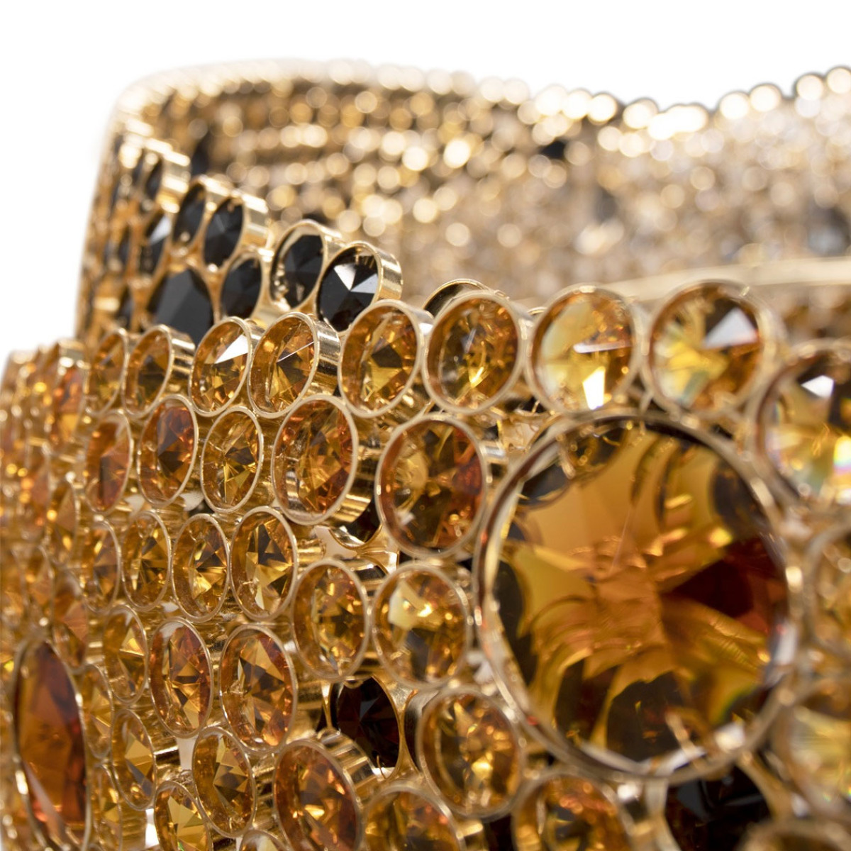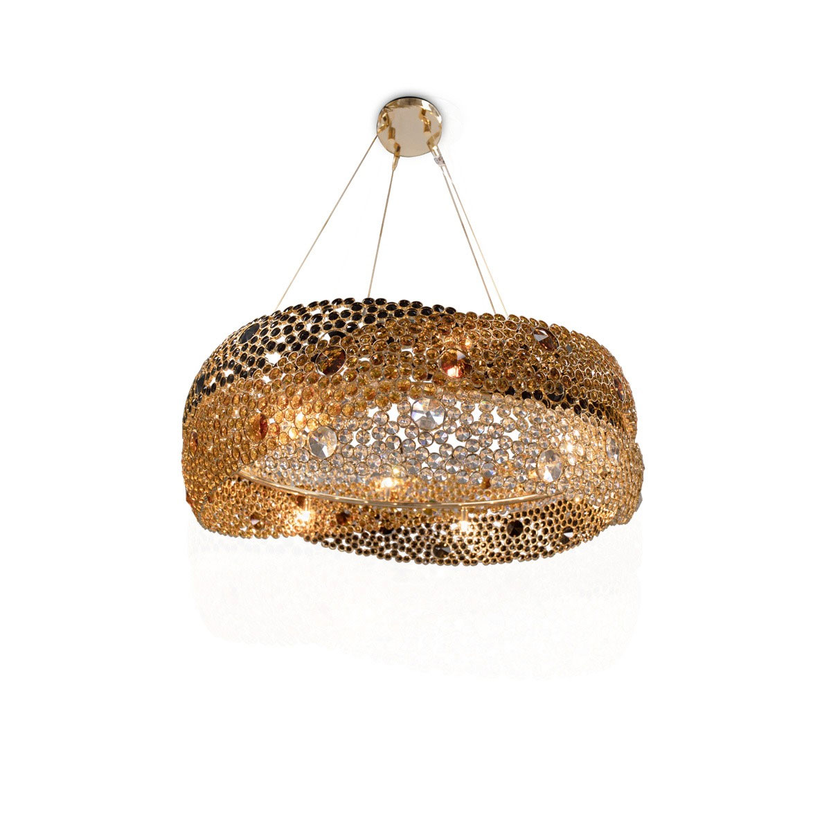 Symbolic of love, fidelity and friendship, three rings composed of clear, amber and black crystals each individually wrapped in brass circles intertwine in the Trinity Chandelier. Infuse everlasting love in your interior with this brilliant statement piece. Original one of a kind chandelier. No two alike, each chandelier created from this design is a one of a kind. This hanging light looks interesting from every angle, and creates enticing shadows. One of the most technical chandeliers created. We approach this sculptural object in a contemporary, unexpected and creative way. Light and shadow interplay while existing harmoniously, using both to manipulate space and thought.
