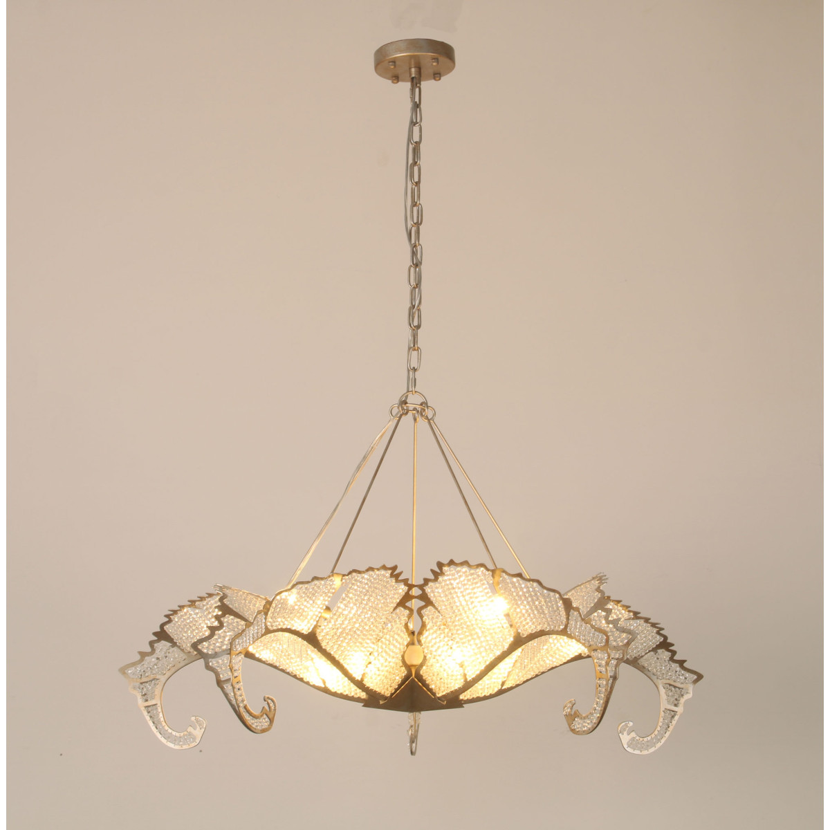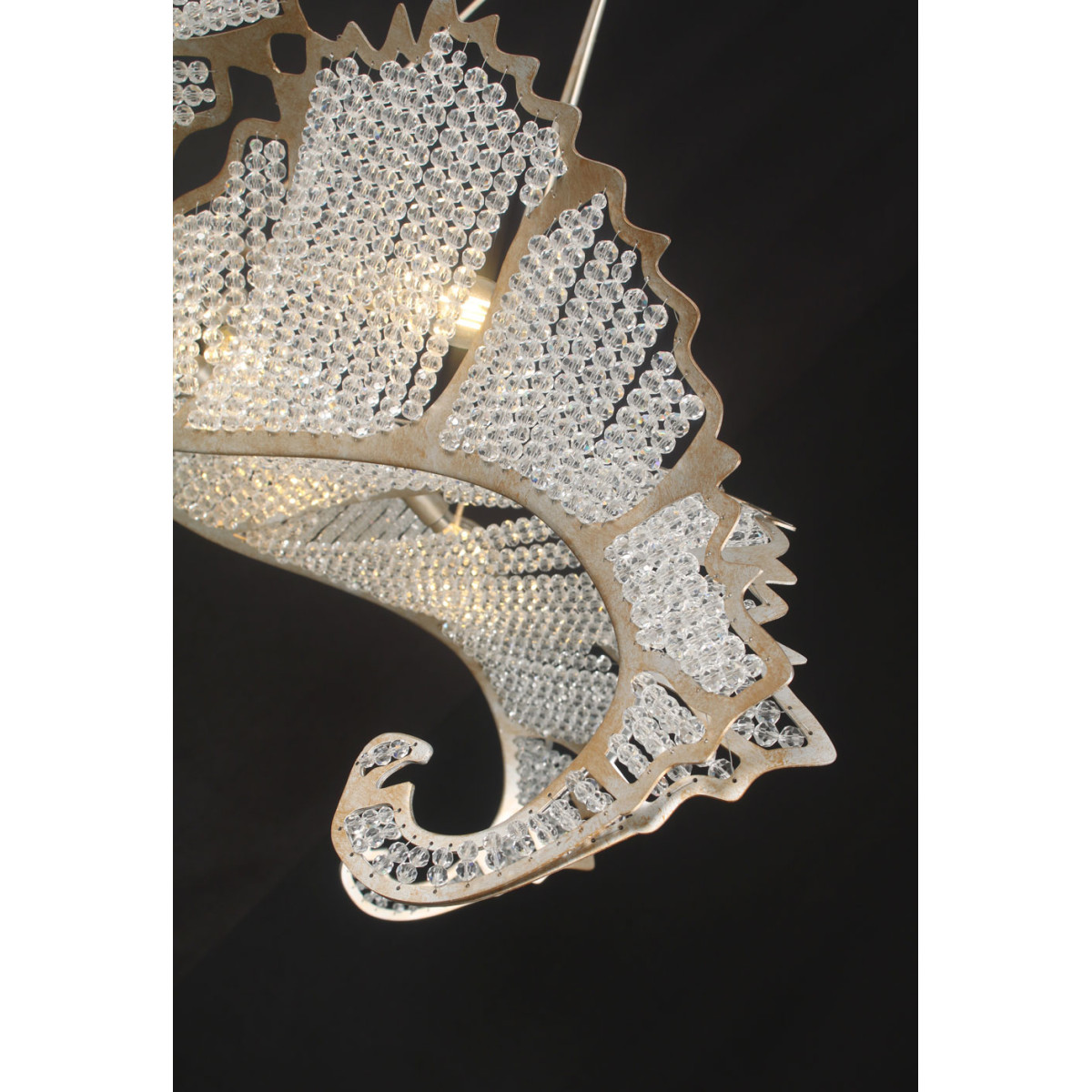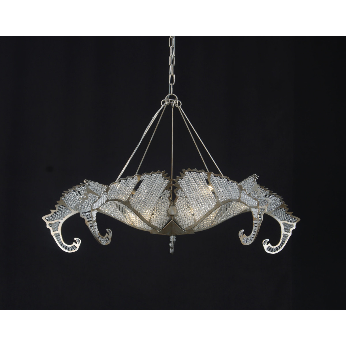 The Biarritz Pendant Fixture design was inspired by nature. From below, the fixture resembles a crystallized snowflake. Viewed from the side, it recalls a cluster of stylized leaves outlined in our Venetian silver leaf finish. Many strands of crystal, resembling the soft veins in a leaf, complete this simple yet stylish design.