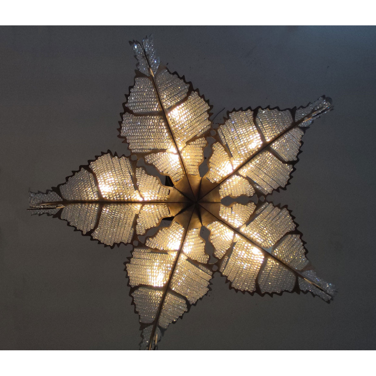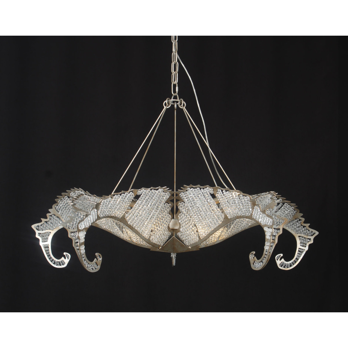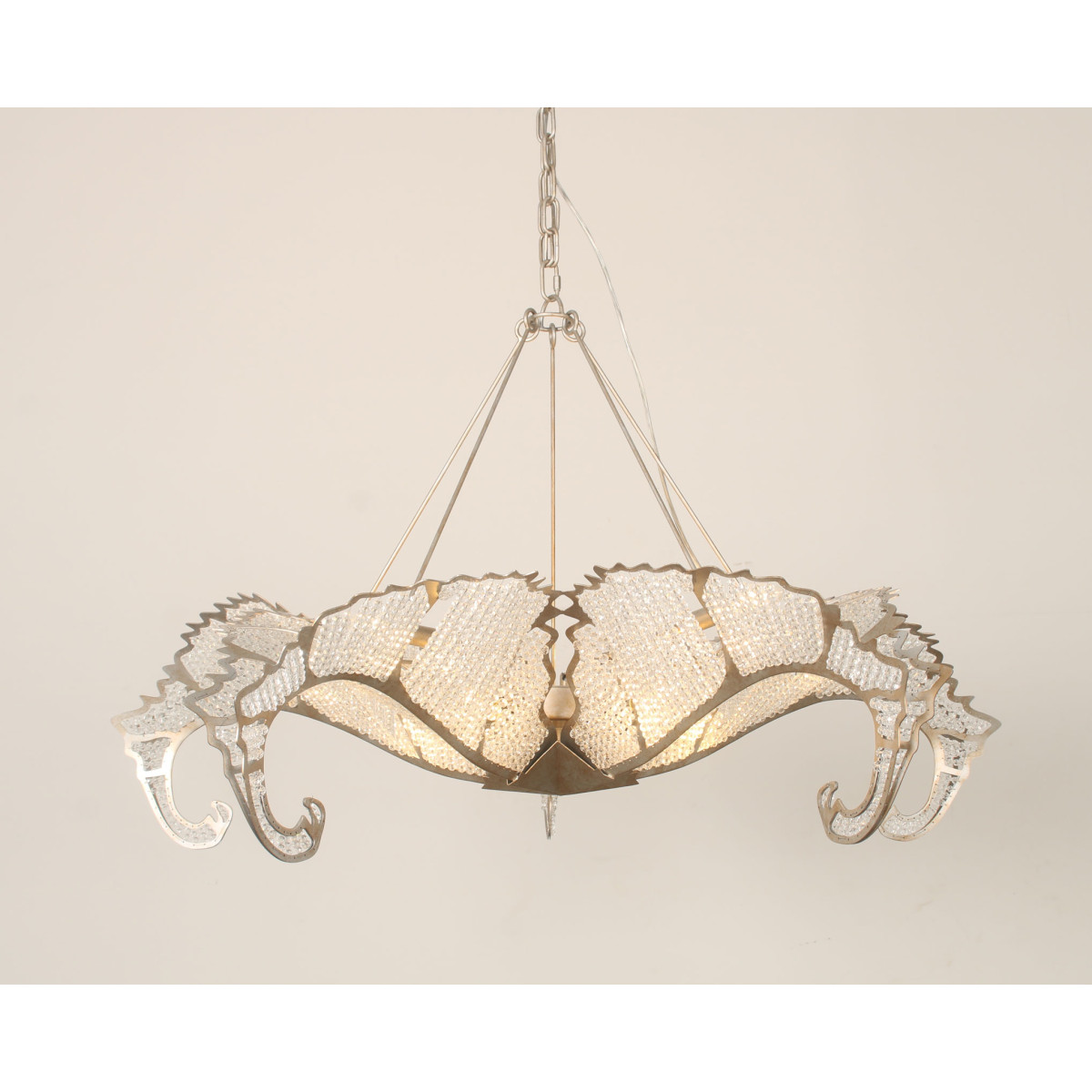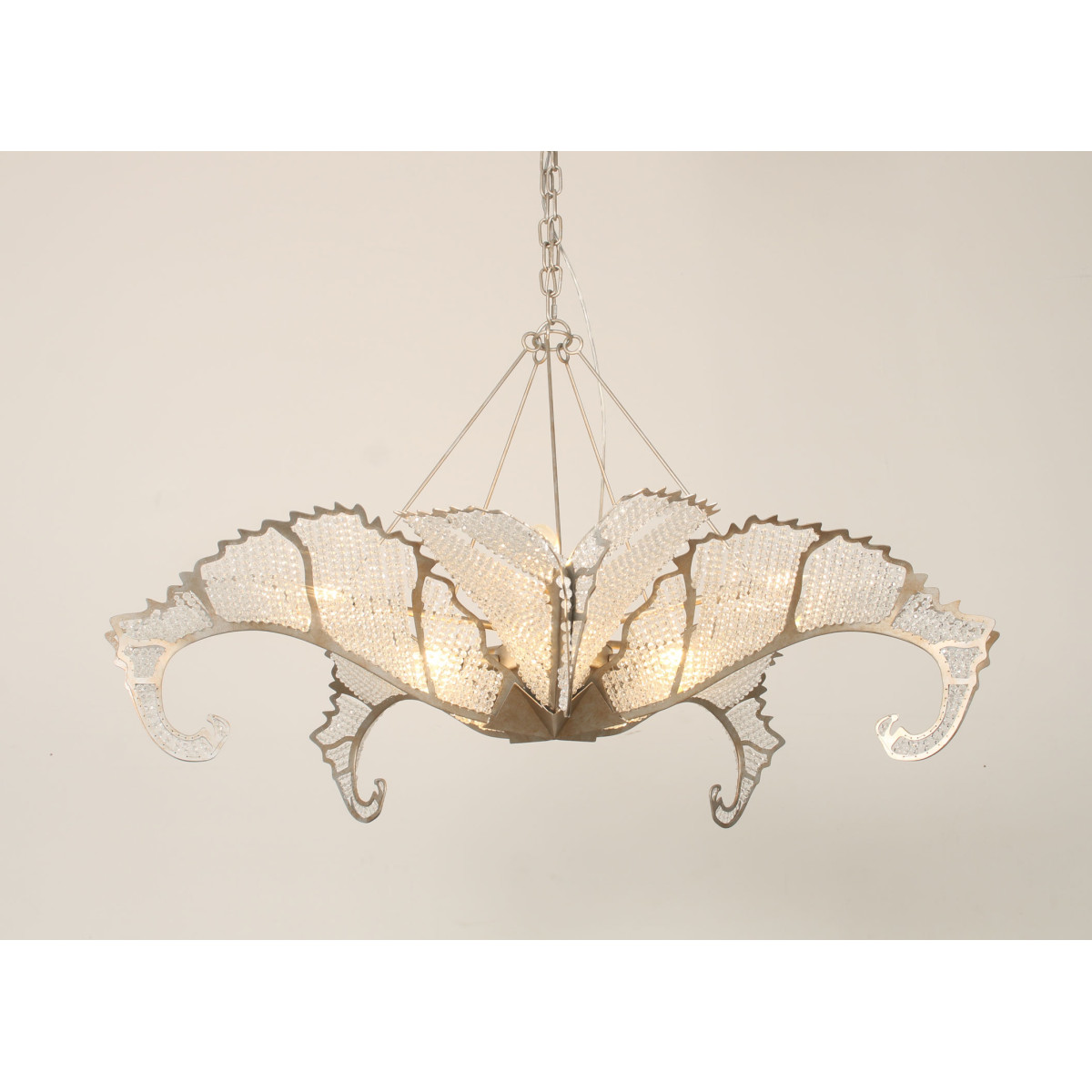 The Biarritz Pendant Fixture design was inspired by nature. From below, the fixture resembles a crystallized snowflake. Viewed from the side, it recalls a cluster of stylized leaves outlined in our Venetian silver leaf finish. Many strands of crystal, resembling the soft veins in a leaf, complete this simple yet stylish design.